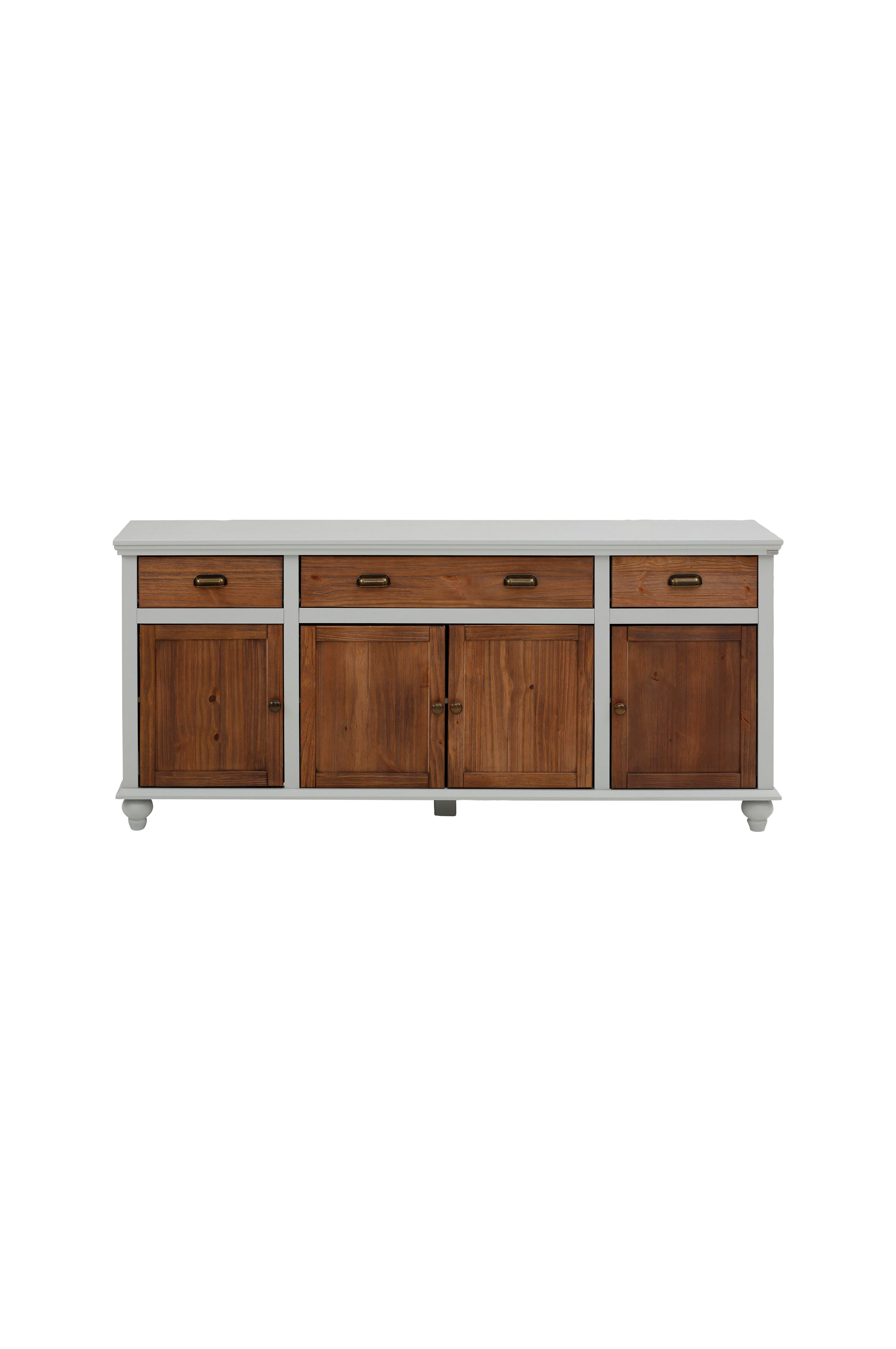 Modernin maalaistalon muotoilunsa ansiosta siitä tulee katseenvangitsija jokaiseen huoneeseen: tilava lipasto. Valkoinen runko, massiivimännystä valmistetut ovet ja laatikot sekä ruskeaksi lakatut, harjatut etulevyt takaavat harmonisen kokonaiskuvan. Sivupöytä sopii täydellisesti kotiisi. Helppohoitoisen pinnan ansiosta se voidaan puhdistaa nopeasti ja vaivattomasti. Oven takana ja tilavissa laatikoissa voi säilyttää pelejä, kirjoja tai muita tavaroita. Yläosassa on riittävästi tilaa tv:lle.