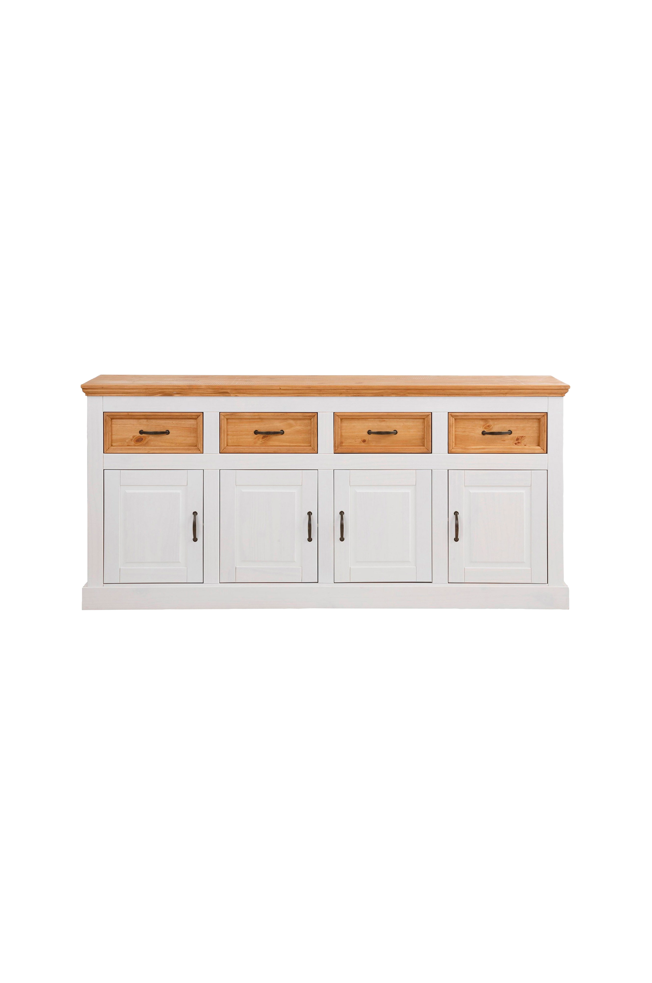 Sivupöytä edustaa ajattoman kaunista maalaistalotyyliä. Tyylikäs tapa luoda lisää säilytystilaa erityisesti pienempiin asuin- tai ruokailutiloihin ja varmistaa järjestys. Etupuolelle integroidut laatikostot ja ovien takana olevat säilytystilat tarjoavat runsaasti tilaa kaikille pienemmille ja suuremmille arjen tavaroille. Ylempää hyllyä voidaan käyttää upeasti koristeideoihin kukka-asetelmilla tai veistoksilla. Se on valmistettu ekologisesti vastuullisesta, fsc®-sertifioidusta massiivipuusta. Antiikkisen näköisestä raudasta valmistetut muodokkaat kahvat asettavat visuaalisia korostuksia.