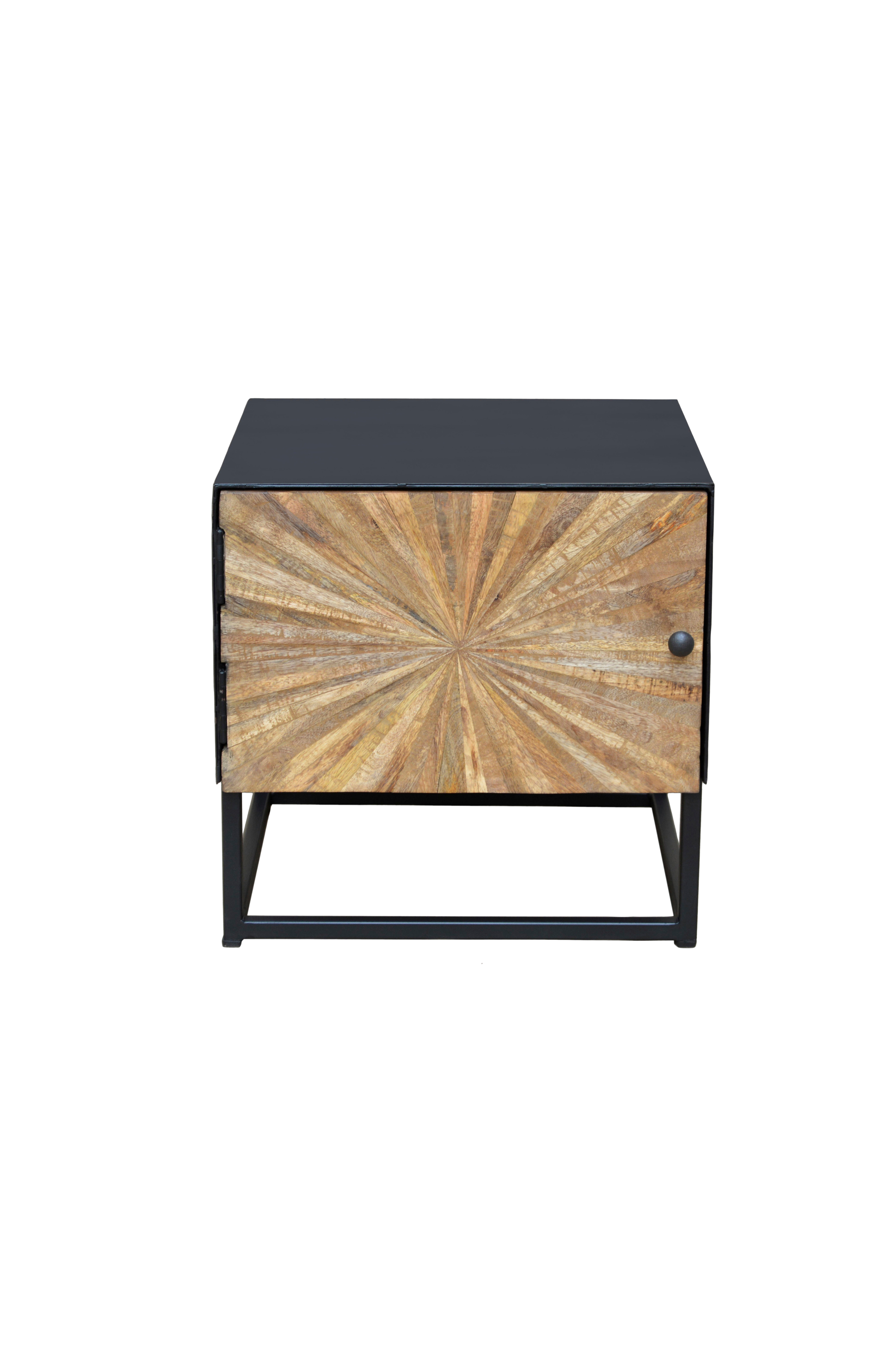 Yöpöytä madira on kaunis ja toimiva huonekalu, joka täydentää makuuhuoneesi. Yöpöytä on valmistettu mangopuusta, joka on luonnollinen ja kestävä materiaali. Yöpöydässä on ruskea ovi, joka avautuu ja paljastaa tilavan hyllyn, jossa voit säilyttää tavaroitasi. Ovessa on metallikahva, joka lisää kontrastia ja mukavuutta. Yöpöydässä on mustat sivu- ja takaosat sekä jalat, jotka luovat tyylikkään ja modernin ilmeen. Yöpöydässä on metallinen jalkakehys, joka lisää vakautta ja tyyliä. madira yöpöytä on loistava tapa lisätä säilytystilaa ja charmia yöpöydällesi.