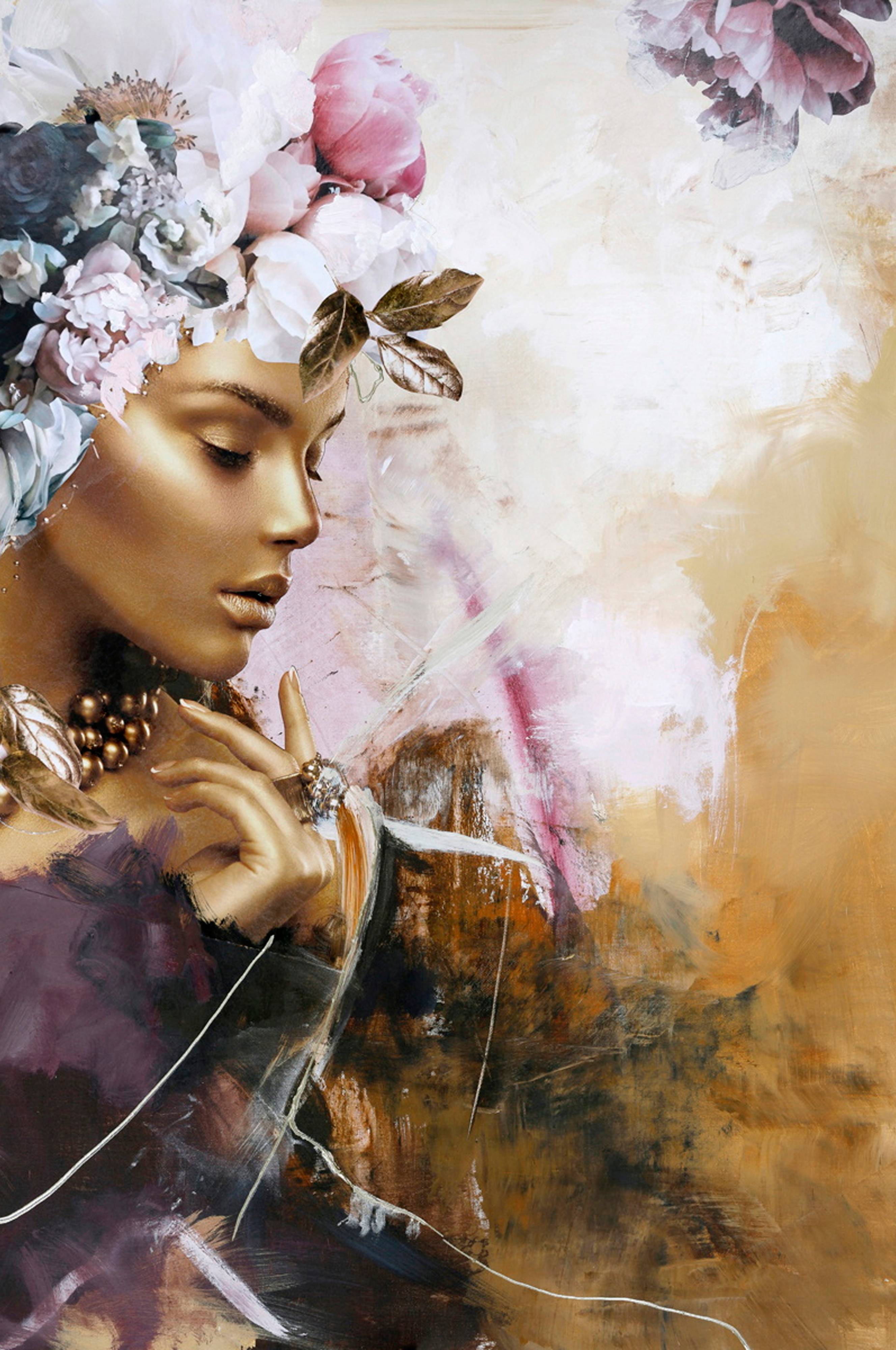 Kanvaasitaulu, josta 50% on painettu ja 50% on taiteilijan käsinmaalaama. Kuvion vaihtelut ovat luonnollisia.