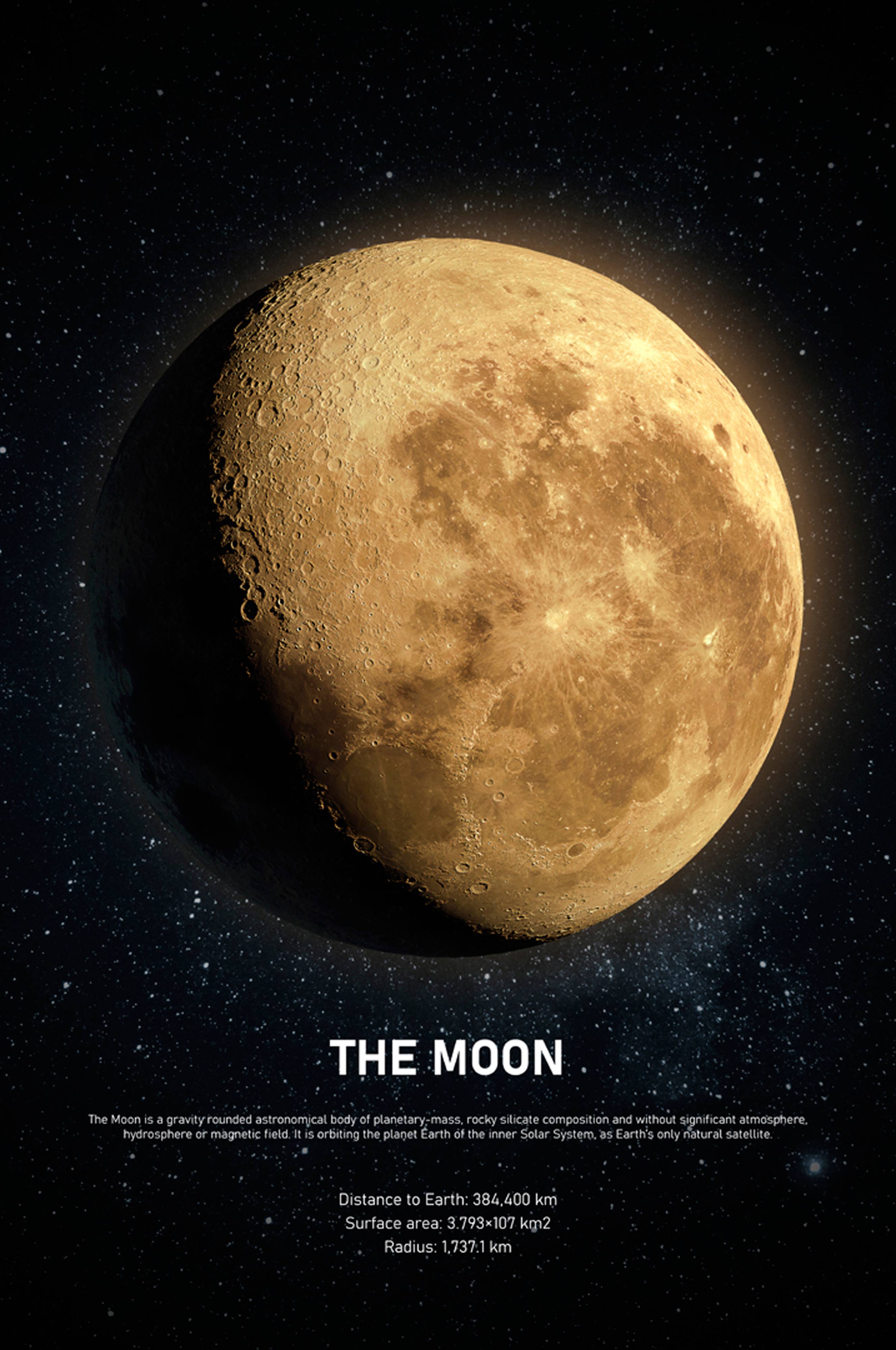 Malerifabrikken The moon -taulu. Painettu pyöreälle MDF-levylle. Seinälle ripustettuna levyn profiili saa aikaan vaikutelman, että taulun etuosa "leijuu" noin 0,5 cm irrallaan seinästä.