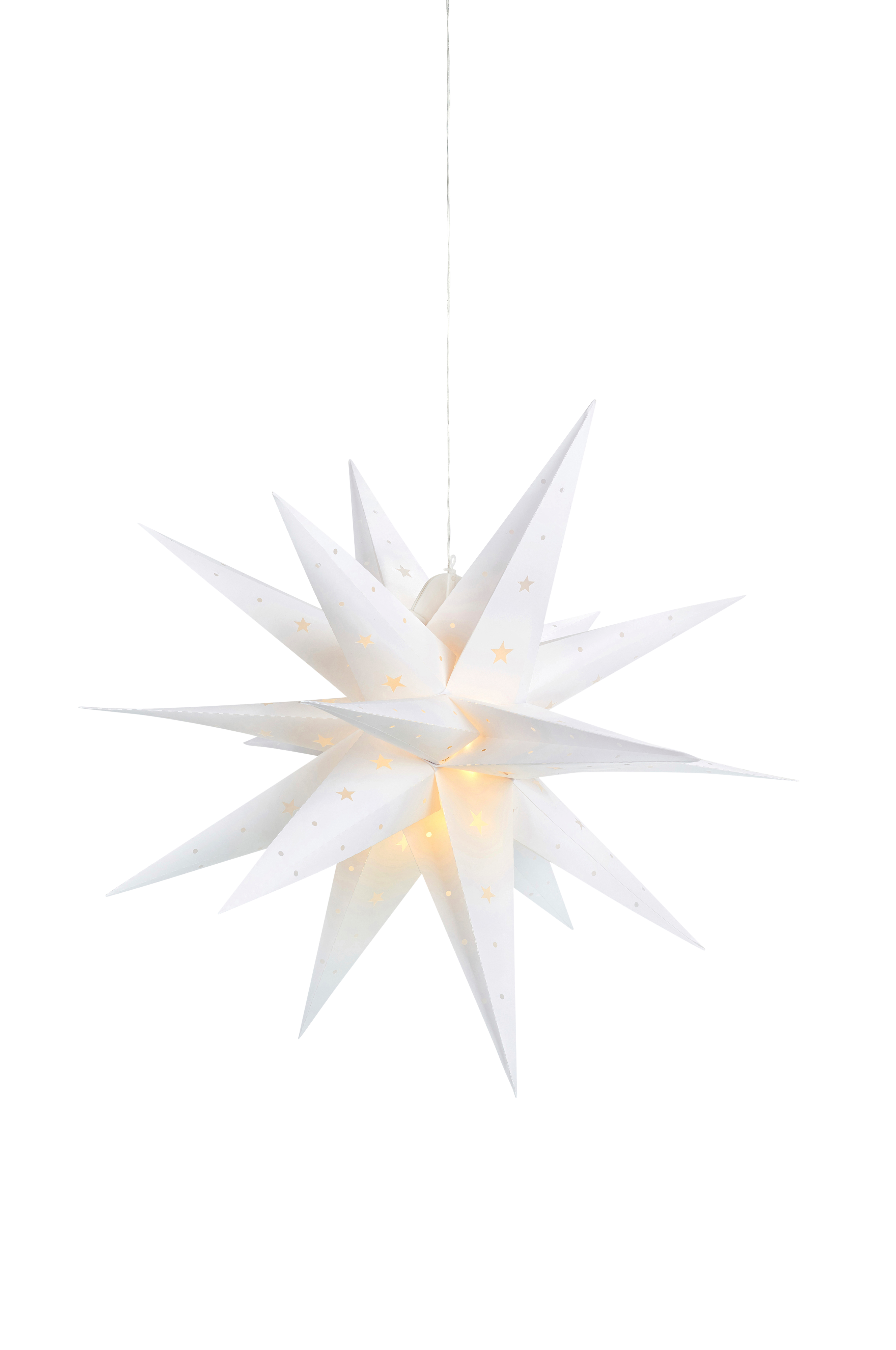 Vectra 3D -valotähti muovia. Sopii sisä- ja ulkokäyttöön. Halkaisija 60 cm. IP44-muuntaja. 12 LED-valonlähdettä. 5 metrin läpikuultava liitäntäjohto.