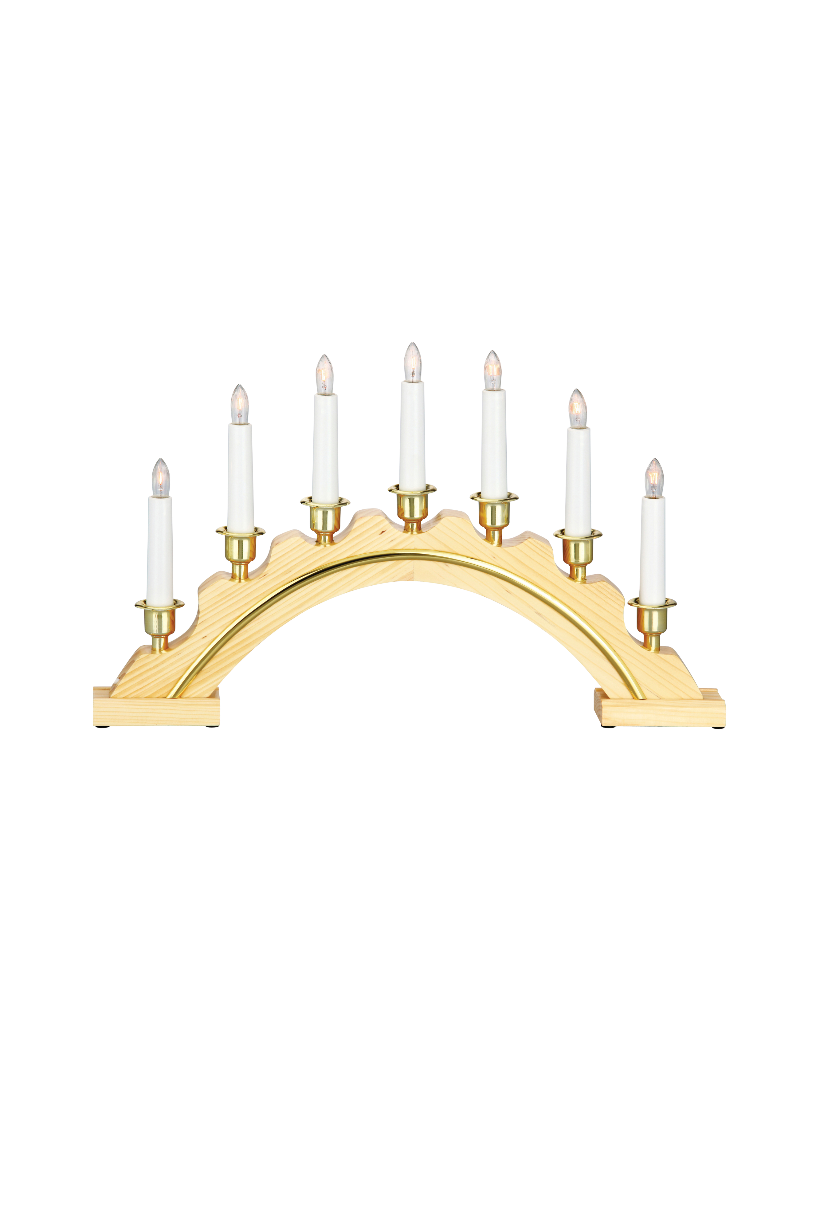 Markslöjdin Celine-sähkökynttelikkö. Runko puuta ja kynttilät muovia. 7xE10-lampunkanta. Enintään 3 W. 2 metrin valkoinen muovijohto, jossa virtakatkaisin ja seinäpistoke. Valonlähteet mukana.