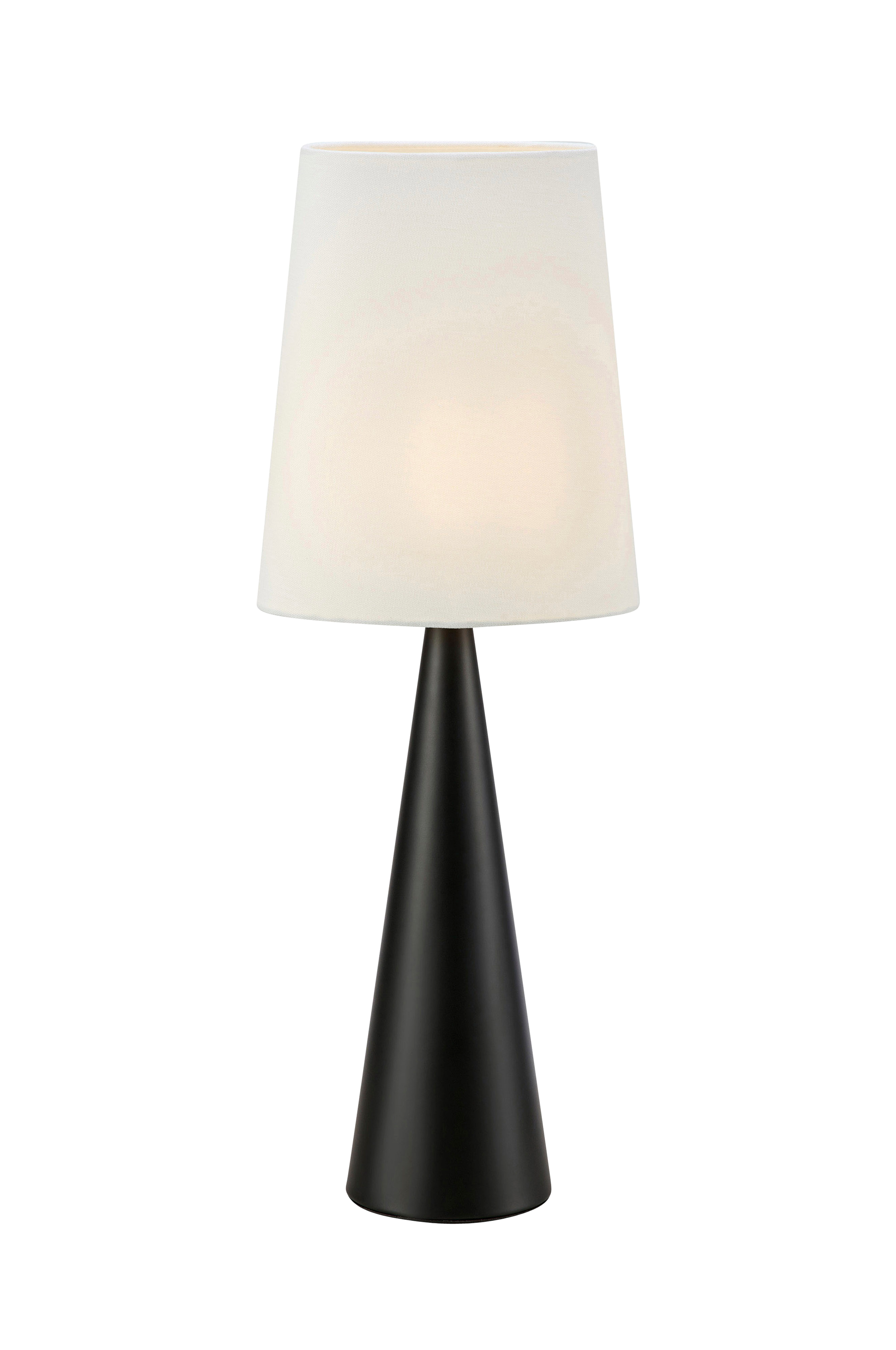 Markslöjd Conus -pöytävalaisin. Kartionmuotoinen alusta metallia ja varjostin kangasta. 2 metrin PVC-johto, jossa virtakatkaisin ja seinäpistoke. 1 x E14, enintään 40 W. Valonlähde ei sisälly toimitukseen.