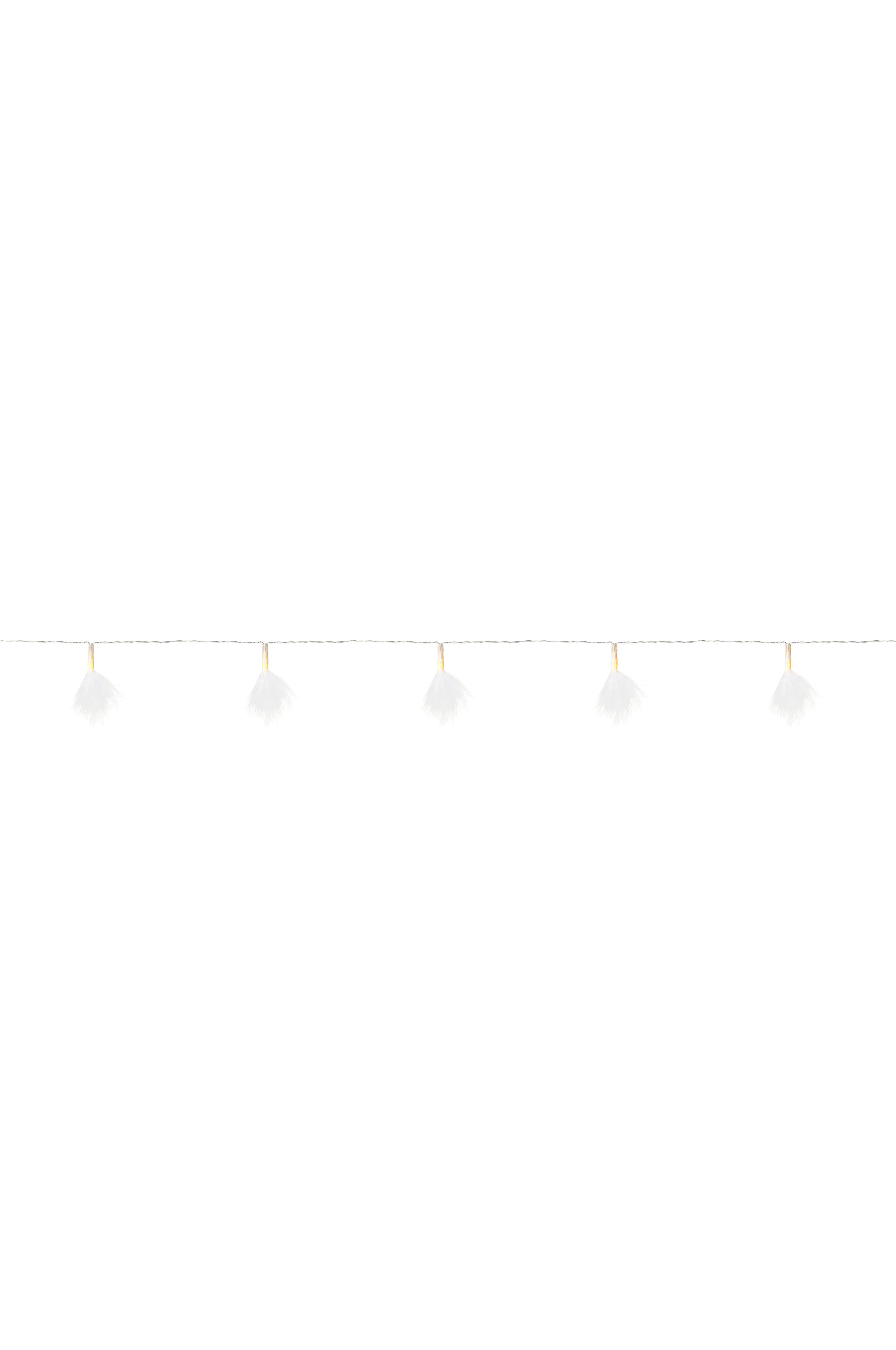 Markslöjdin paristokäyttöinen Dun-valosarja, jossa höyheniä. 15 integroitua lämpimän valkoista LED-valonlähdettä. 2,70 metrin muovijohto. 2,20 m, jossa valot ja 0,5 metriä paristokoteloon. Toimii kolmella AA-paristolla. Tilaa paristot erikseen. Virtakatkaisin kotelossa.