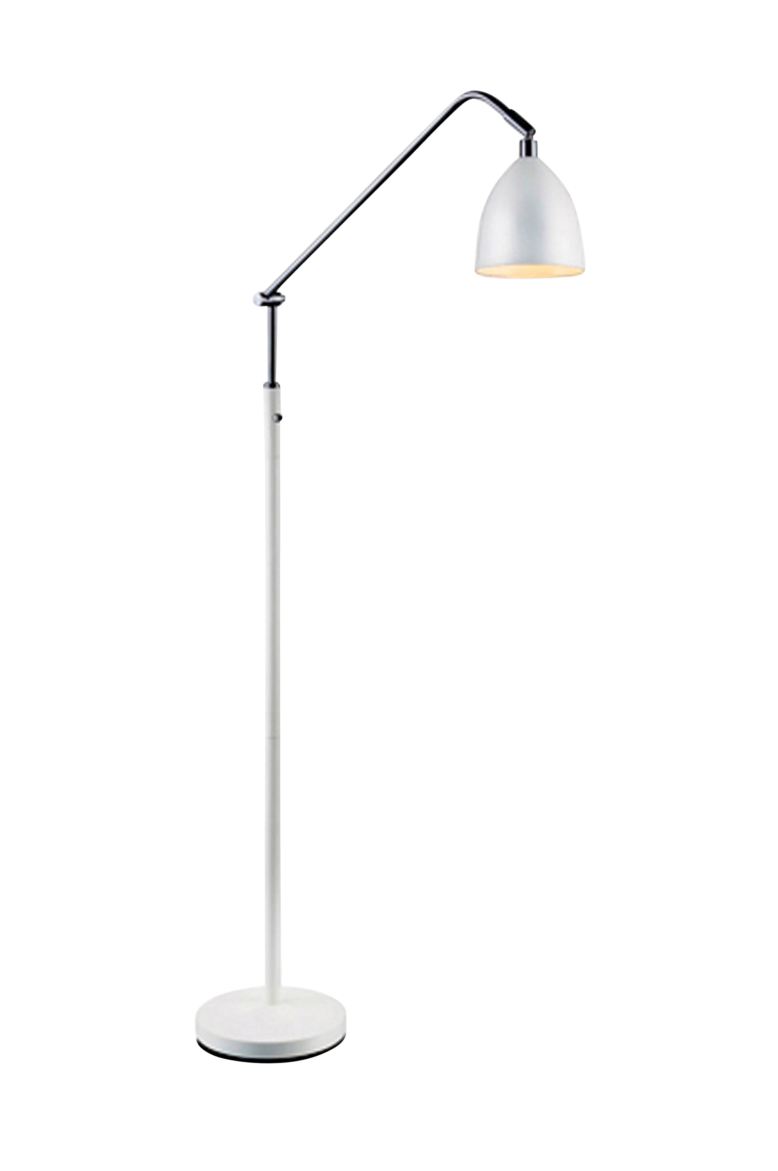 Valkoiseksi maalattu Fredrikshamn-lattiavalaisin. Krominväriset detaljit. Leveys 20 cm. Syvyys 53 cm. Korkeus 152 cm. Kääntyvä valaisinpää.