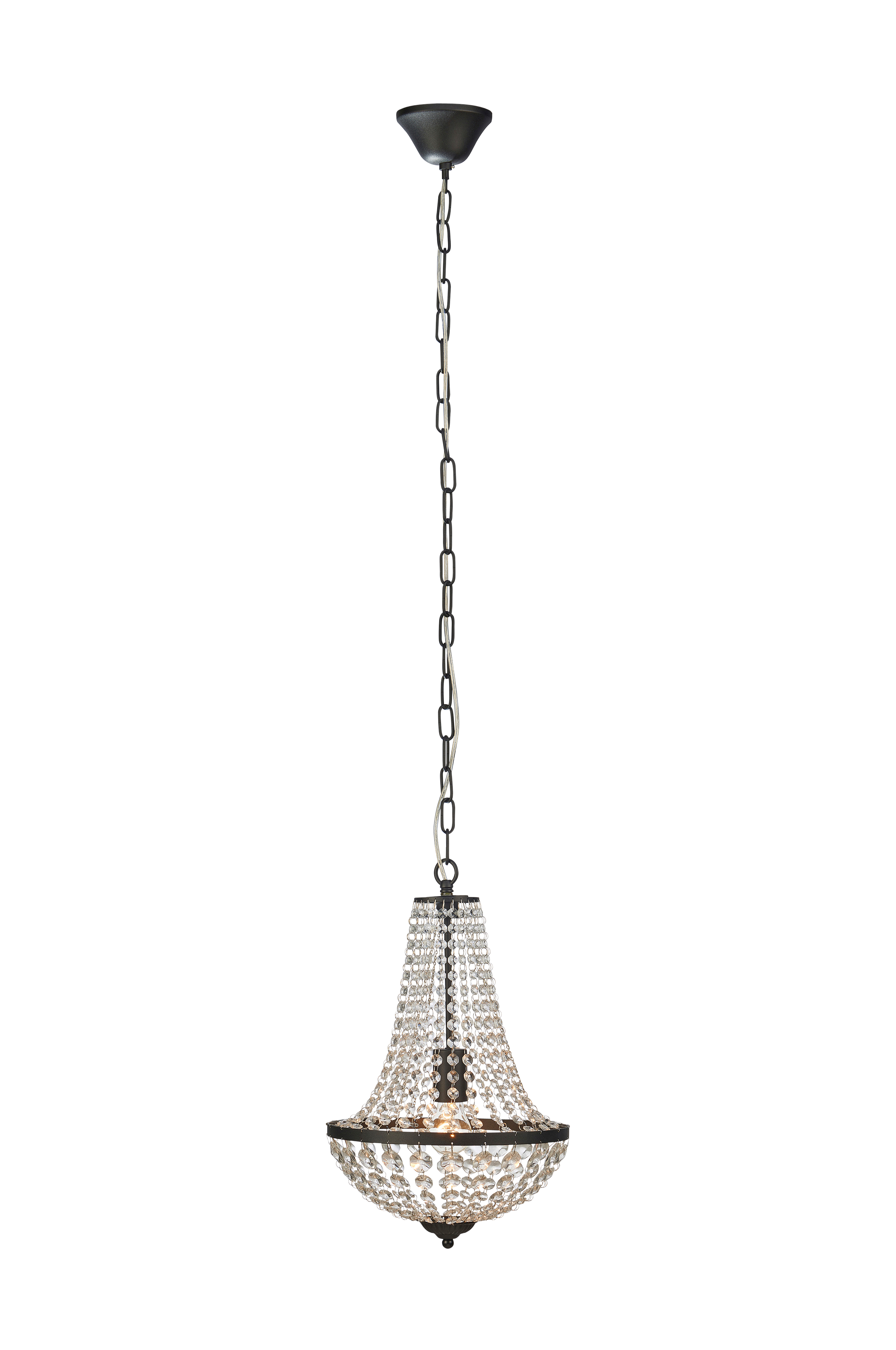 Markslöjd Gränsö -kristallikruunu. Mustaa metallia, kirkkaat prismat. 1,5 m:n ketju ja ripustuskoukku. Iso lampunkanta E27, enintään 1 x 60 W:n hehkulamppu tai vastaava halogeeni-, energiansäästö- tai LED-lamppu. Valonlähde ei mukana.