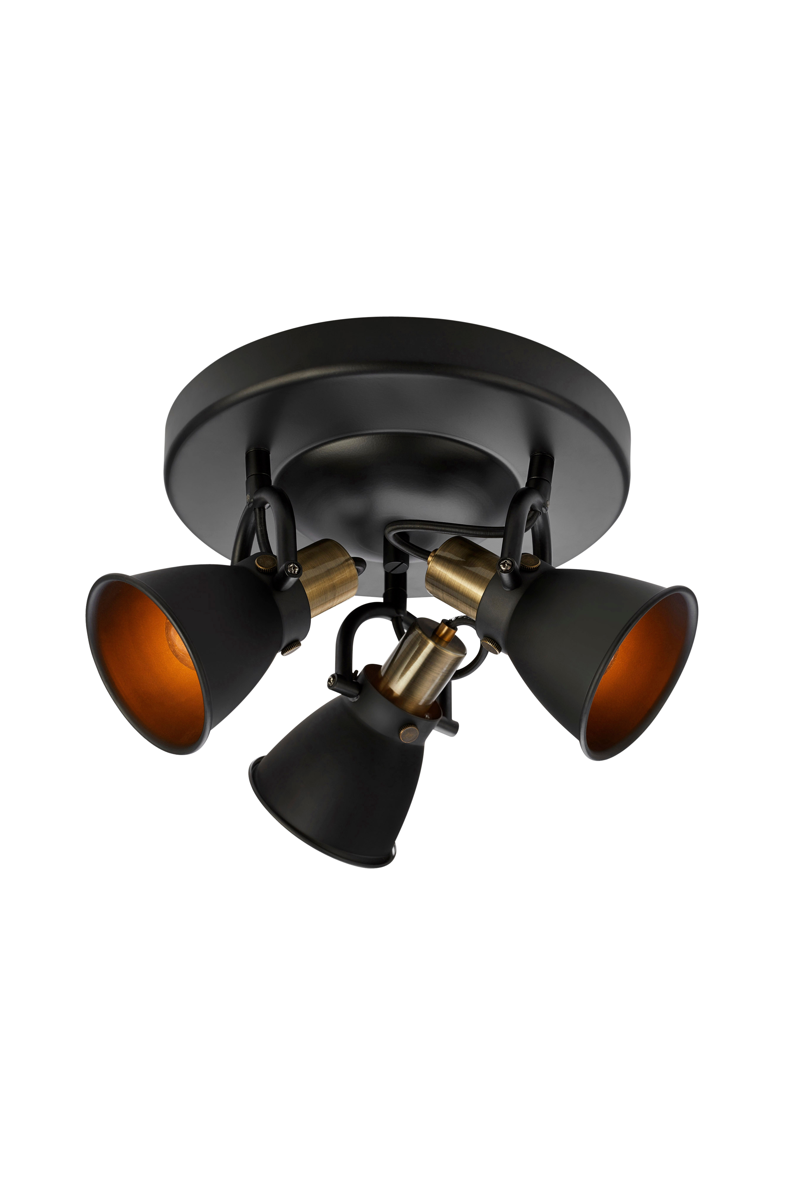 Moderni kohdevalaisin, jossa pyöreä metallinen pohjalevy. Suunnattavissa kohdevaloissa on krominväriset yksityiskohdat. Ripustuskoukku. Enintään 3x40 W. E14-lampunkanta. Halkaisija 32 cm ja korkeus 16 cm. Valonlähde ei sisälly toimitukseen.