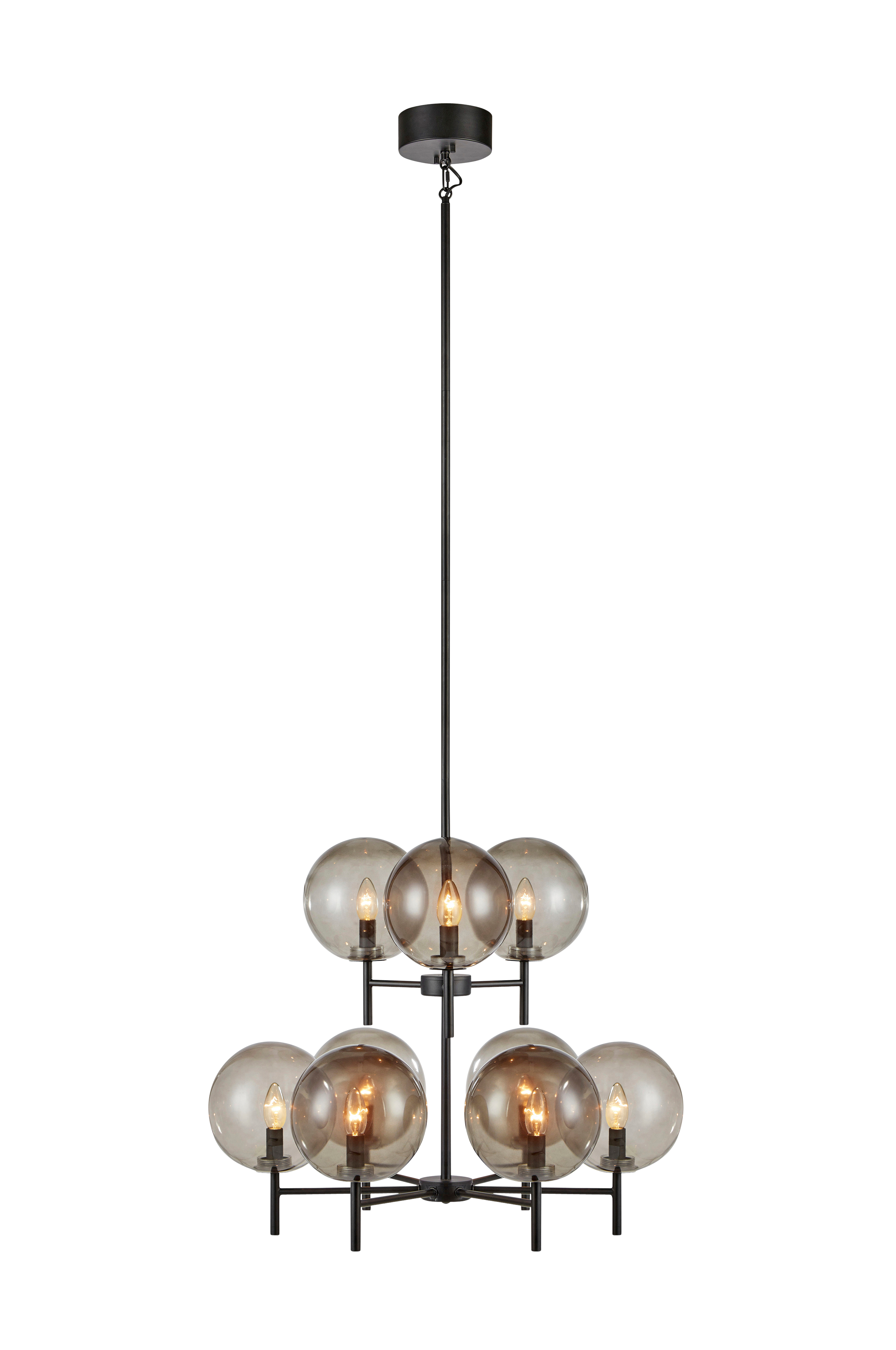 Markslöjd Crown -kattovalaisin. Metallisessa riippuvalaisimessa on kauniit lasikuvut. Kuvun halkaisija 25 cm. 2 m:n läpikuultava johto, jossa virtakatkaisin. Enintään 1x60 W. E27-lampunkanta. Kokonaishalkaisija 70 cm ja kokonaiskorkeus 173 cm. Valonlähde ei sisälly toimitukseen.