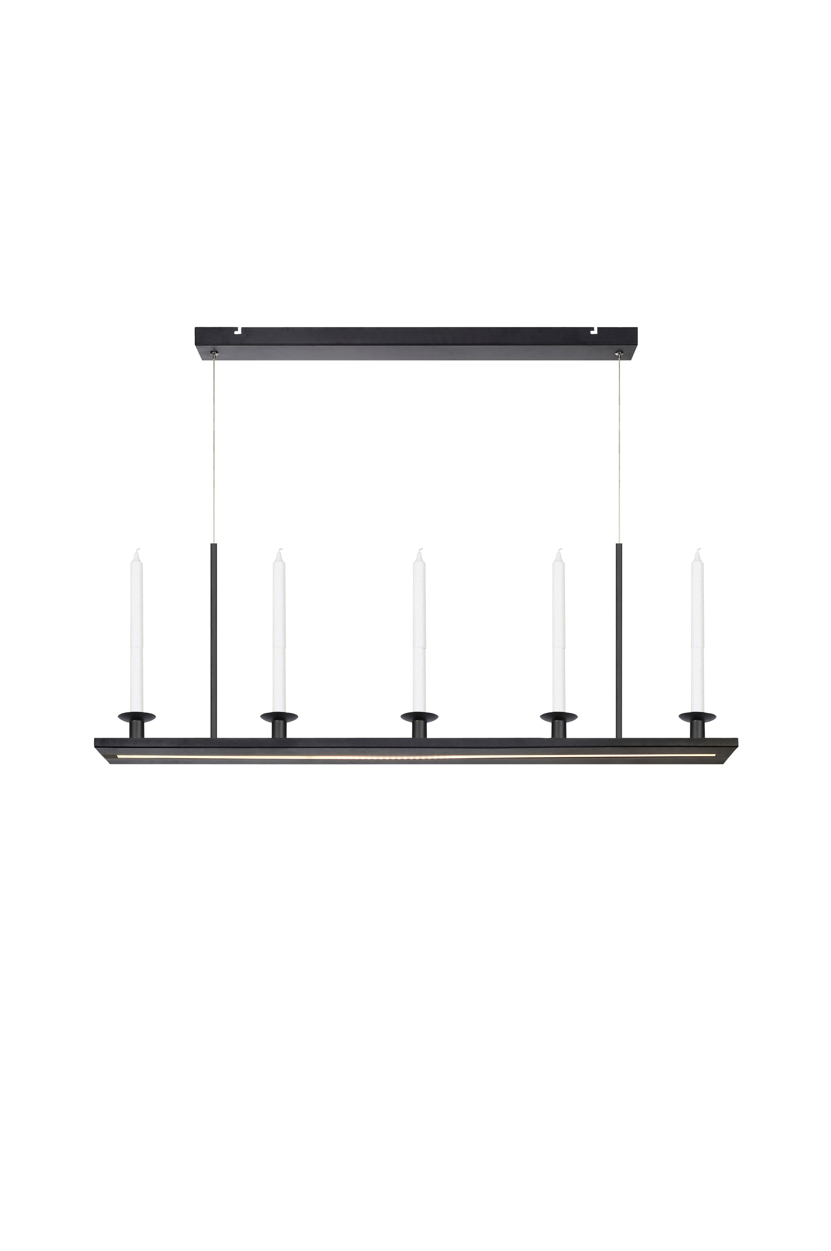 Kattovalaisin mustaa metallia, yläpuolella viisi kynttilänpidikettä. 22 W:n led-lista alapuolella. Leveys 105 cm, syvyys 12,5 cm ja korkeus 39,5 cm.Ei sisällä kattopistoketta perustuen uuteen EU-direktiiviin. Tilaa erikseen.