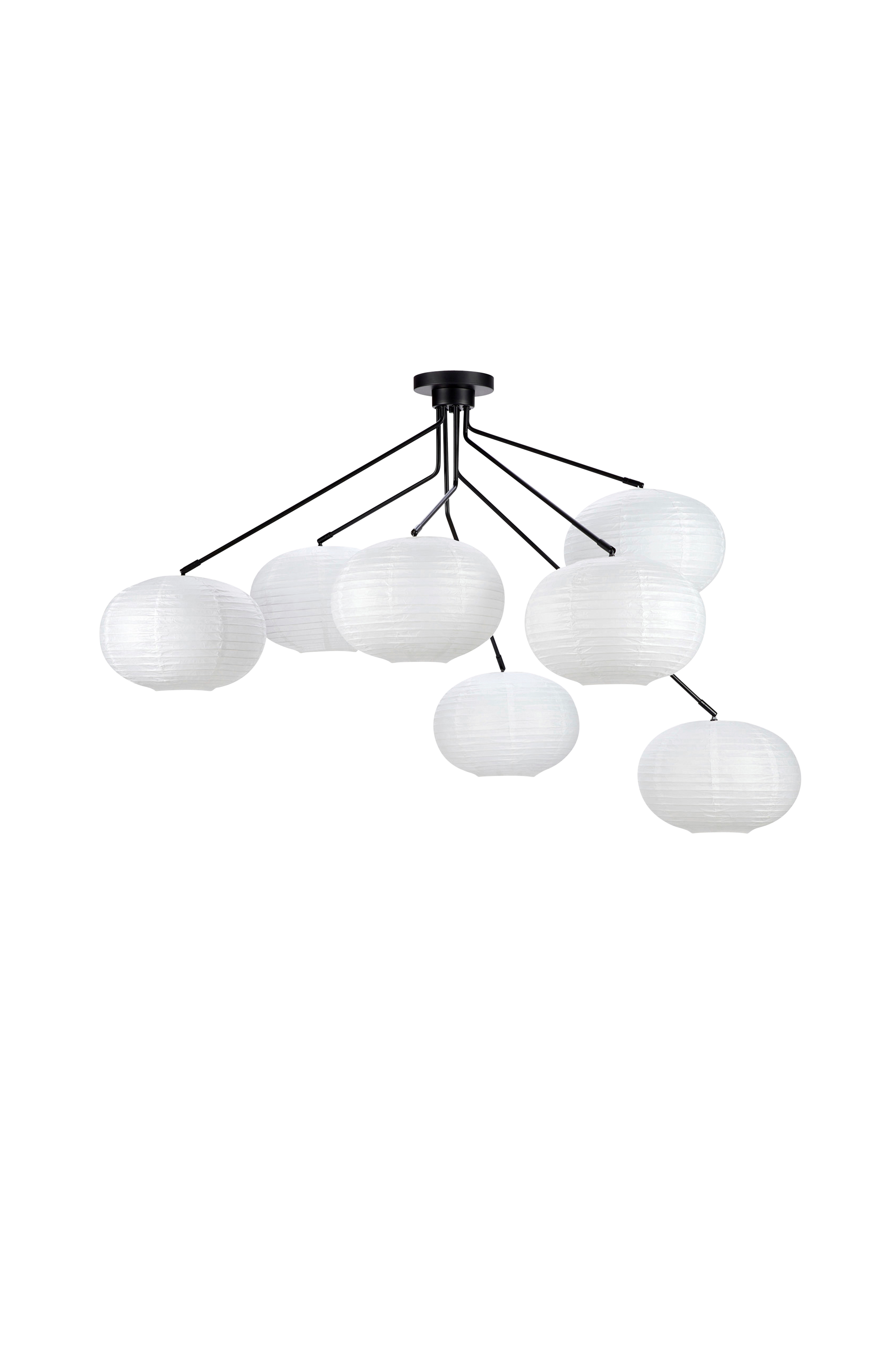Galaxy-kattovalaisin, jossa metallirunko ja 7 riisipaperivarjostinta. Säädettävät varret. Asennetaan kattokiinnikkeen avulla. Metallinen kattokuppi. 7 x E27-lampunkanta. Enintään 15 W. Valonlähteet eivät sisälly toimitukseen.