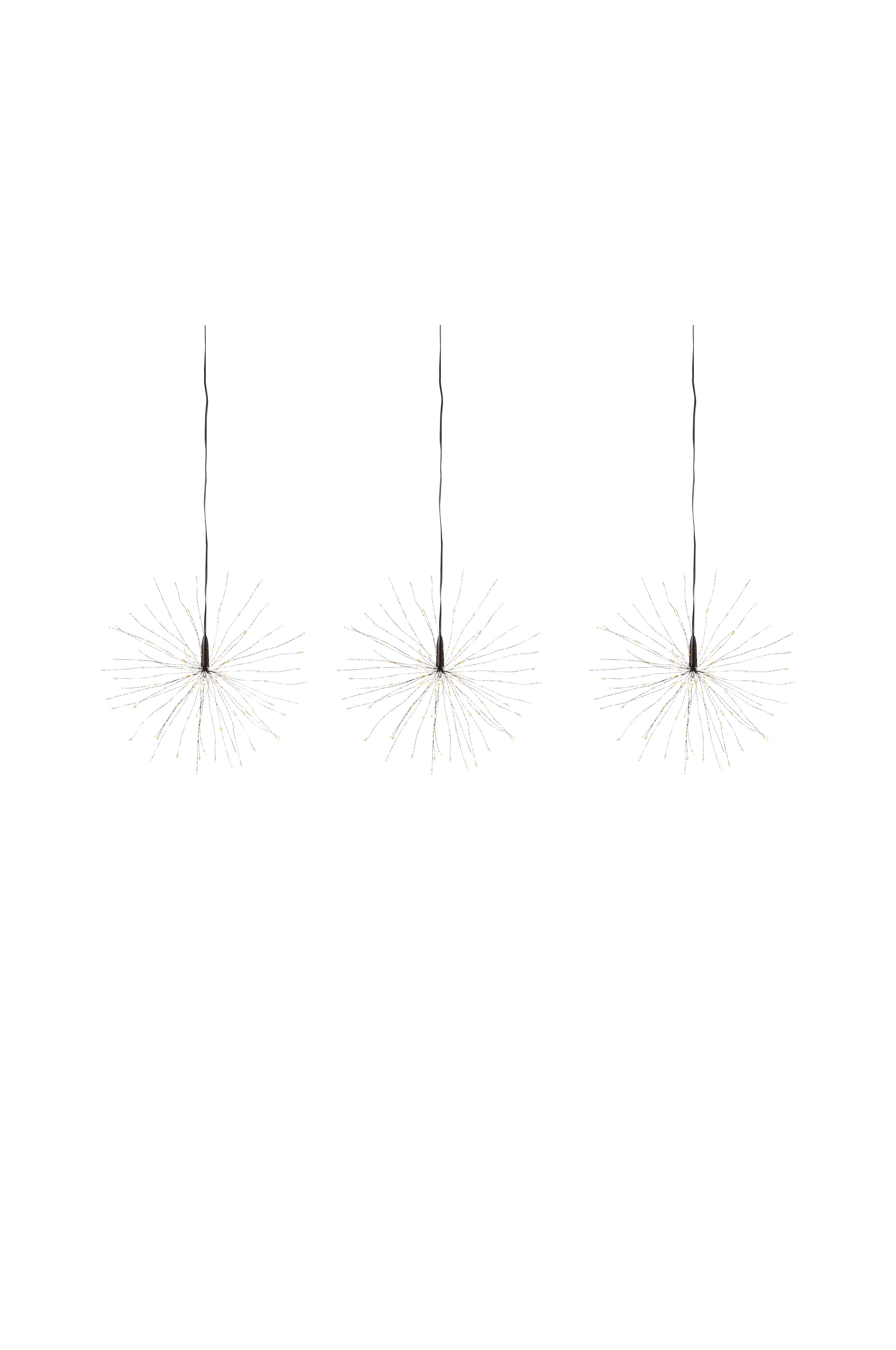 Meteor-koristeet, 3 kappaleen setti. 270 integroitua lämpimän valkoista LED-lamppua 4,8 W. Koristeiden välinen etäisyys 2 metriä. 3 koristetta, jokaisen pituus 25 cm. 5 metrin johto muovia. Elektroninen pistokemuuntaja. Hyväksytty ulkokäyttöön.