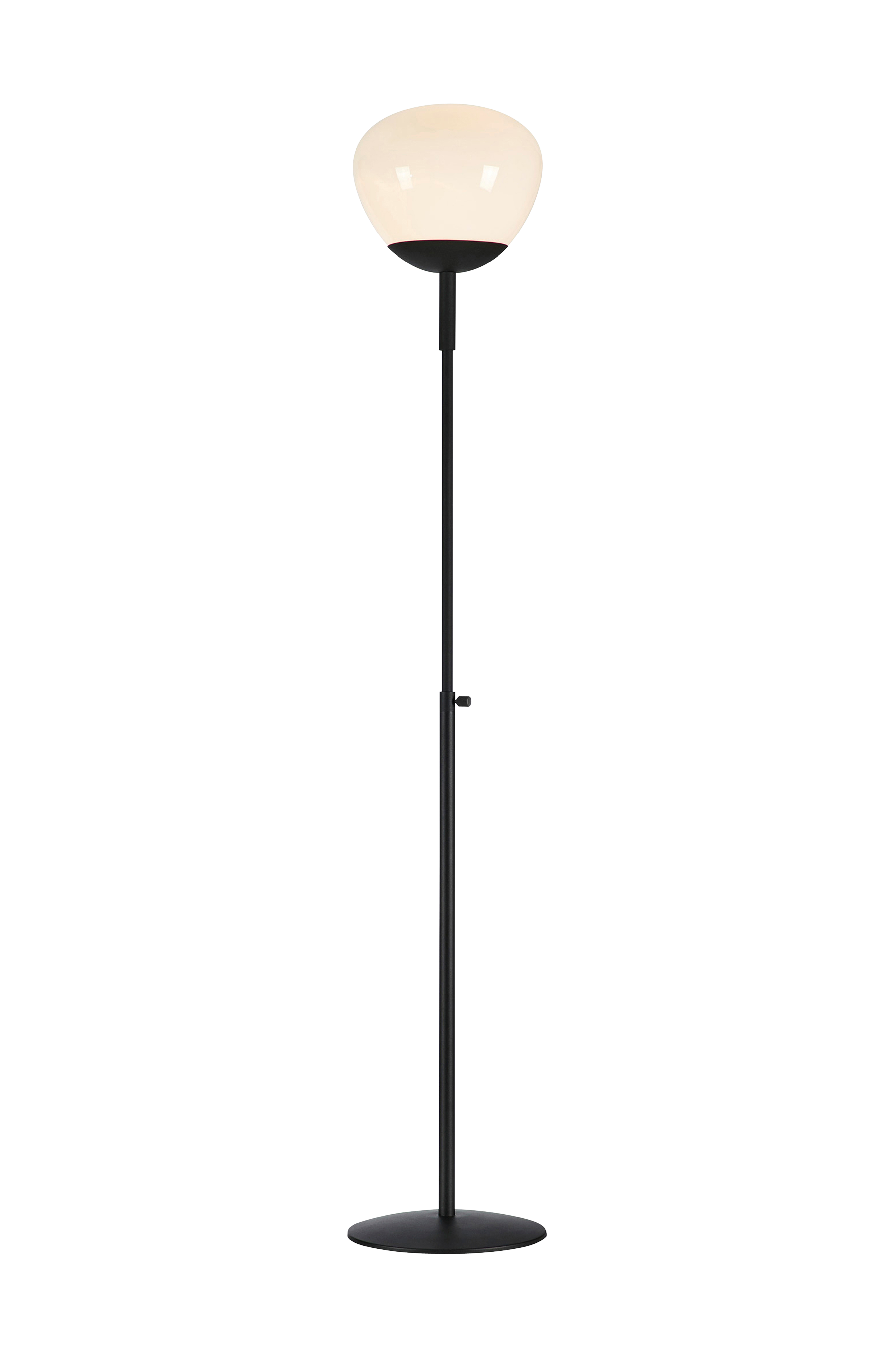Markslöjdin Rise-lattiavalaisin, jossa metallirunko ja lasivarjostin. Jalassa säädettävä korkeus. 200 cm:n pituinen kangasjohto, jossa katkaisin ja pistoke. Valonlähde ei sisälly toimitukseen. Suunnittelija Monika Mulder.