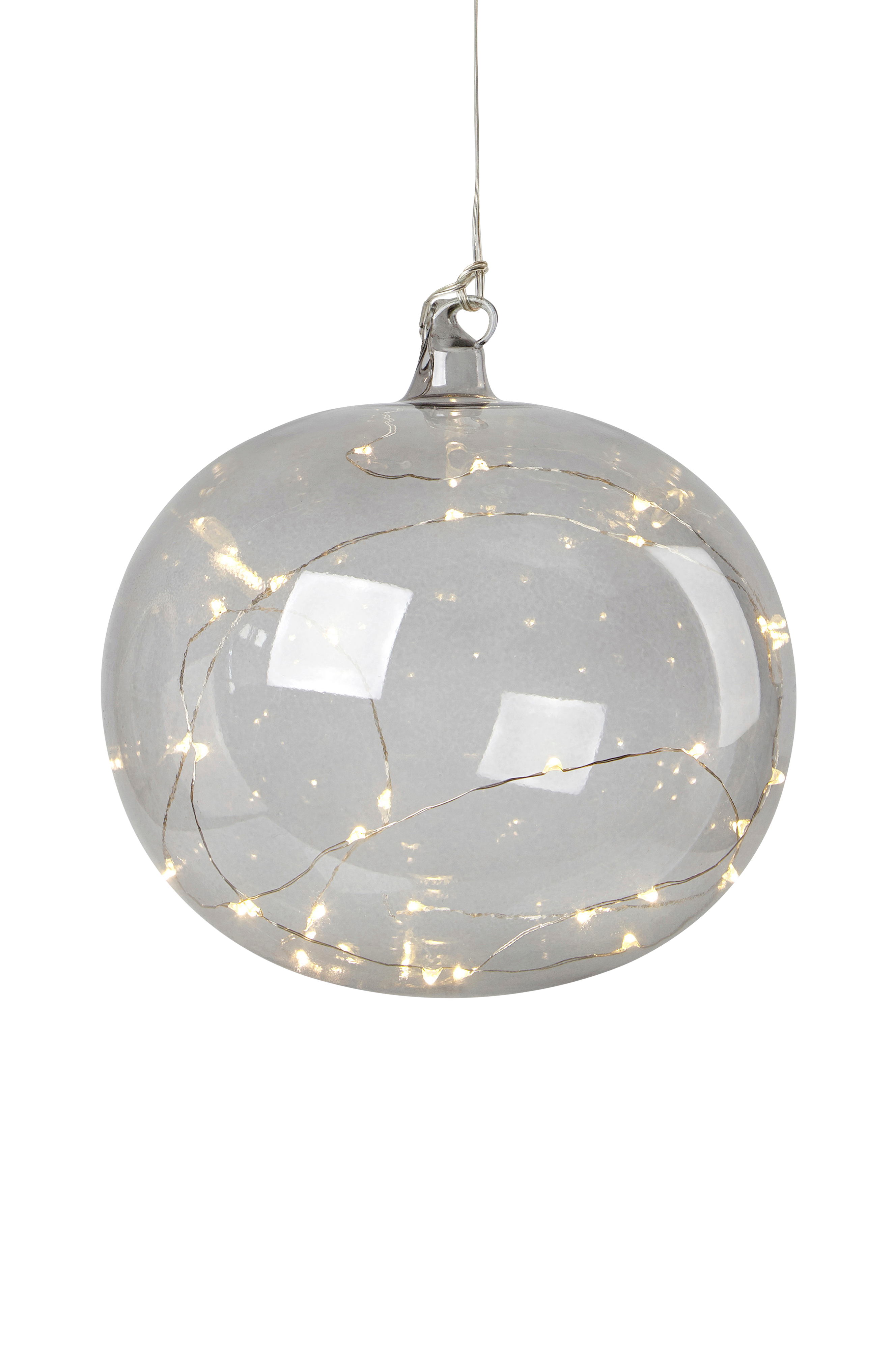 Roikkuva Lina-lasipallo. Lasipallo Ø 18 cm. Paristorasia. Toimii kolmella AA-paristolla (eivät sisälly toimitukseen). Johdon pituus 150 cm.