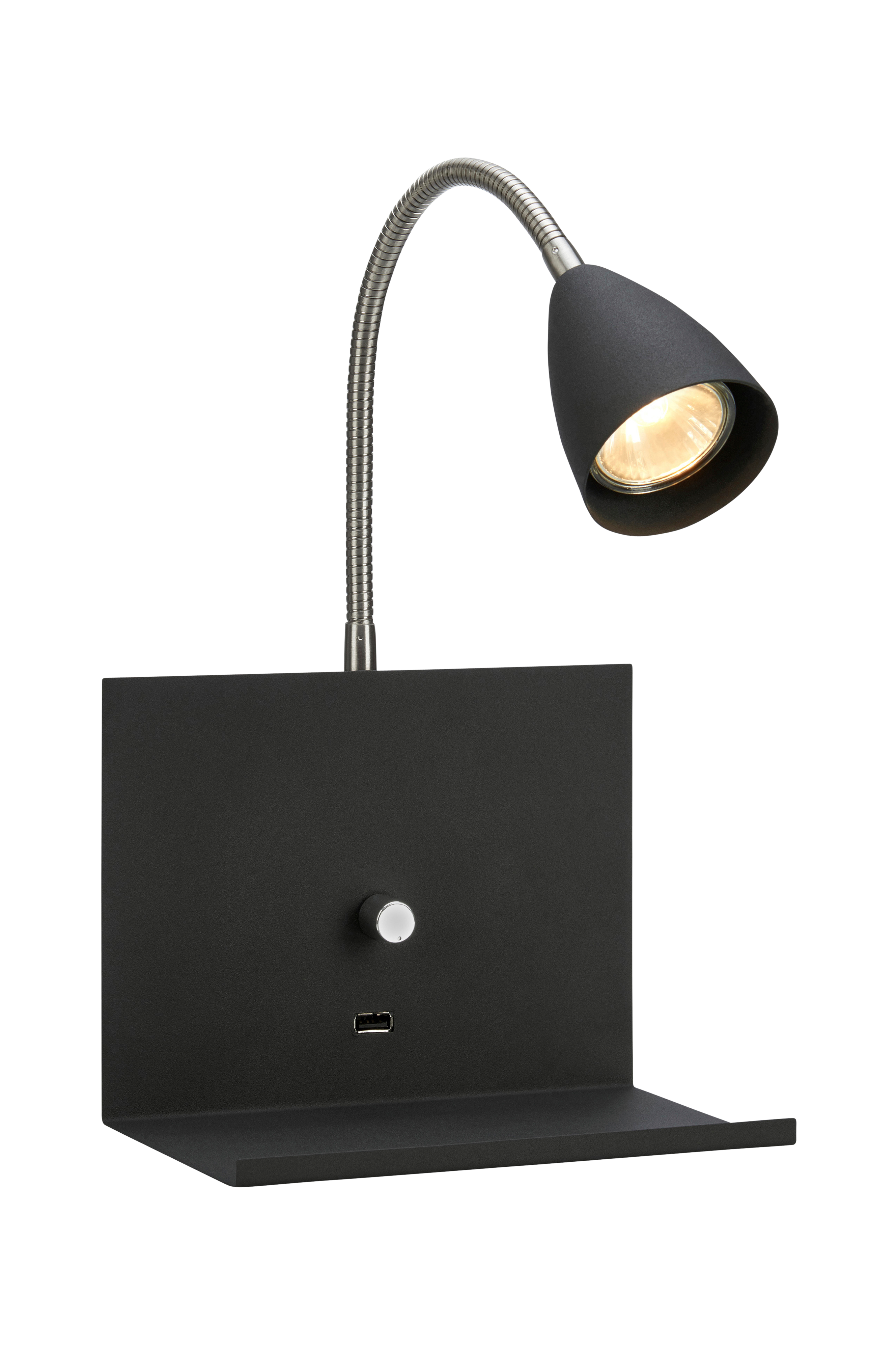 Markslöjd Logi -seinävalaisin. Säädettävä lukulamppu. Taivutettava varsi. Sisäänrakennettu himmennin enintään 7W LED. USB-liitäntä puhelimen, tabletin, kameran jne. latausta varten. Läpikuultava johto 2 m. Valonlähde ei mukana.