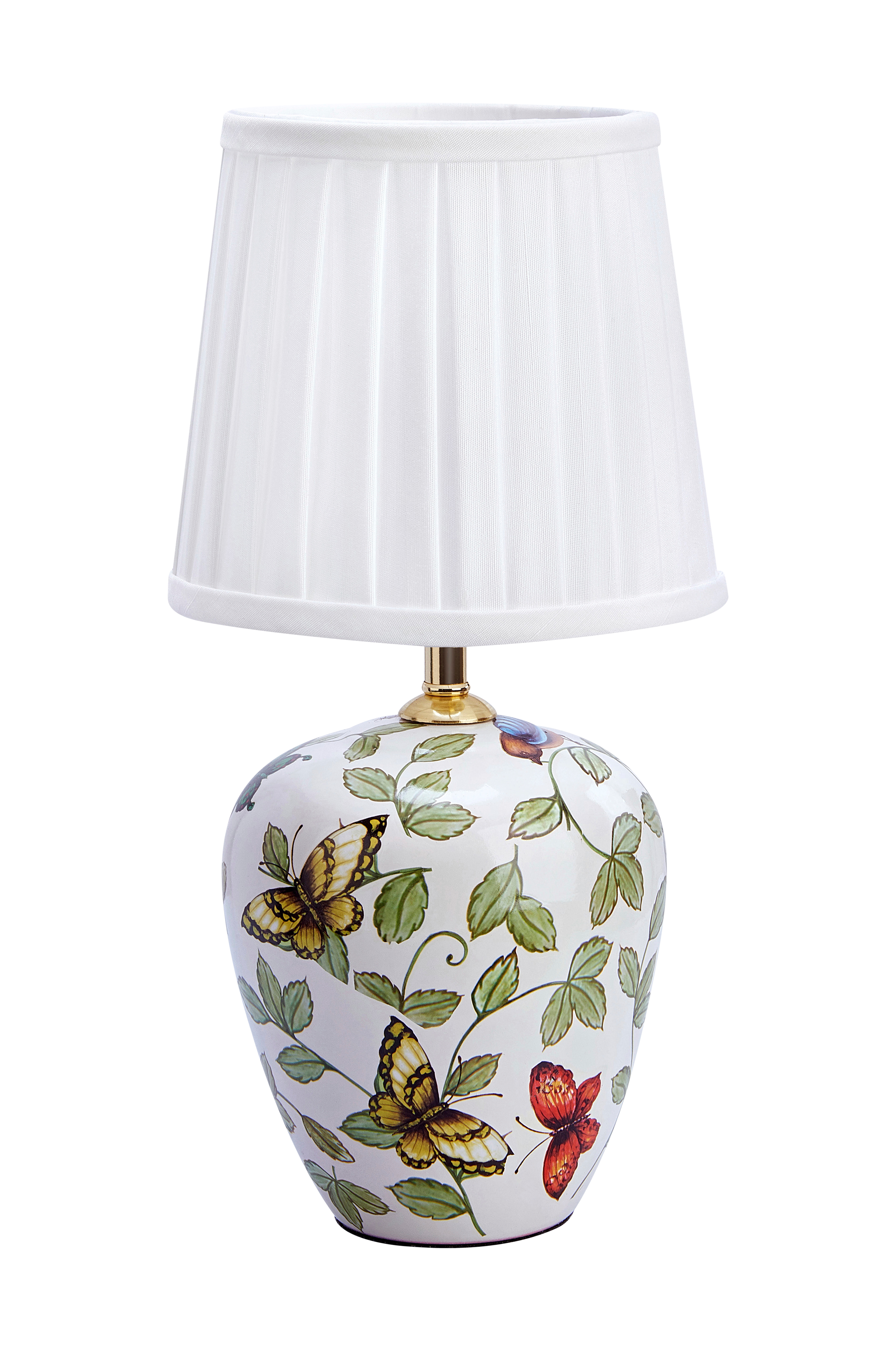 Markslöjd Mansion-pöytävalaisin. Jalka valkoista keramiikkaa, jossa perhoskuvio. Valkoinen kangasvarjostin. 2 m:n läpikuultava johto. Virtakytkin johdossa. Pieni lampunkanta E14, enintään 40 W.