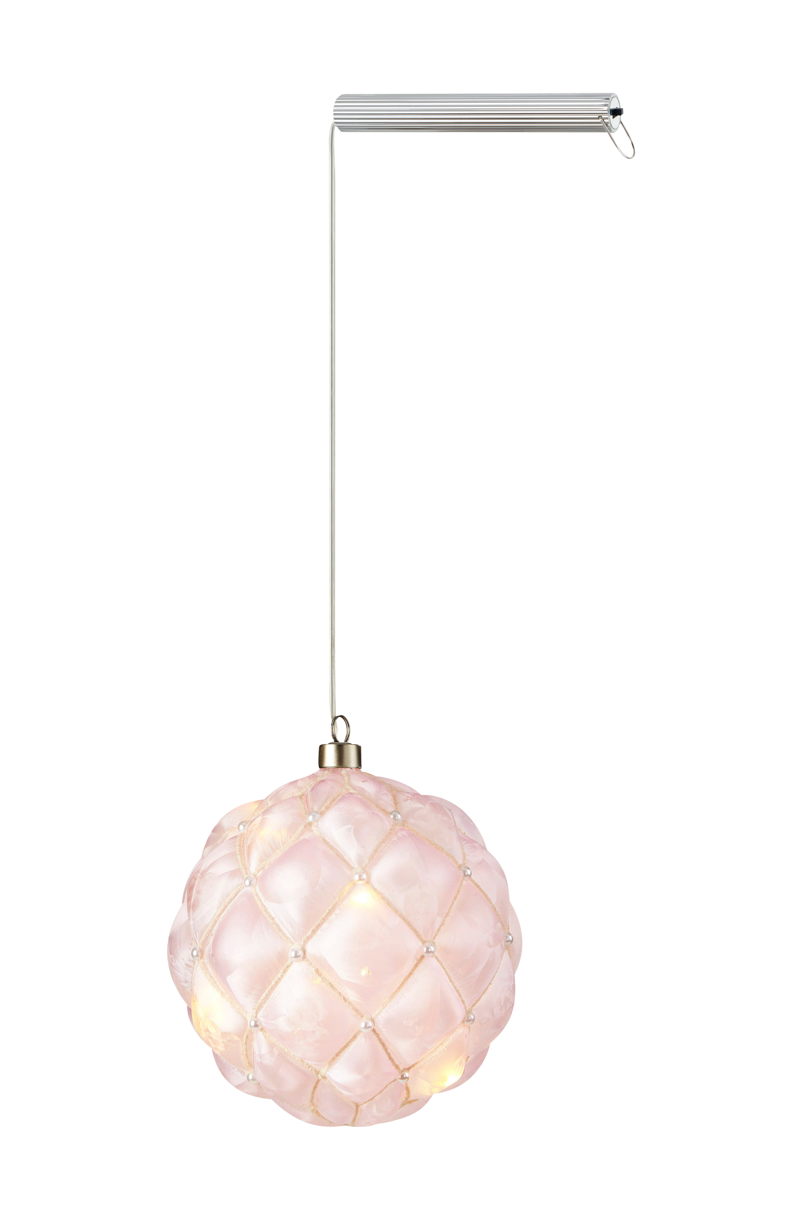 Riippuva valokoriste, jossa helmiä. Sisäpuolella LED-valoköynnös, jossa 20 diodia. Pallossa kiinteä 0,03 W:n LED-valaistus. Toimii kolmella AA-paristolla. Tilaa paristot erikseen. Virtakytkin ajastintoiminnolla paristorasiassa. Halkaisija 15 cm. Läpikuultava johto 300 cm.