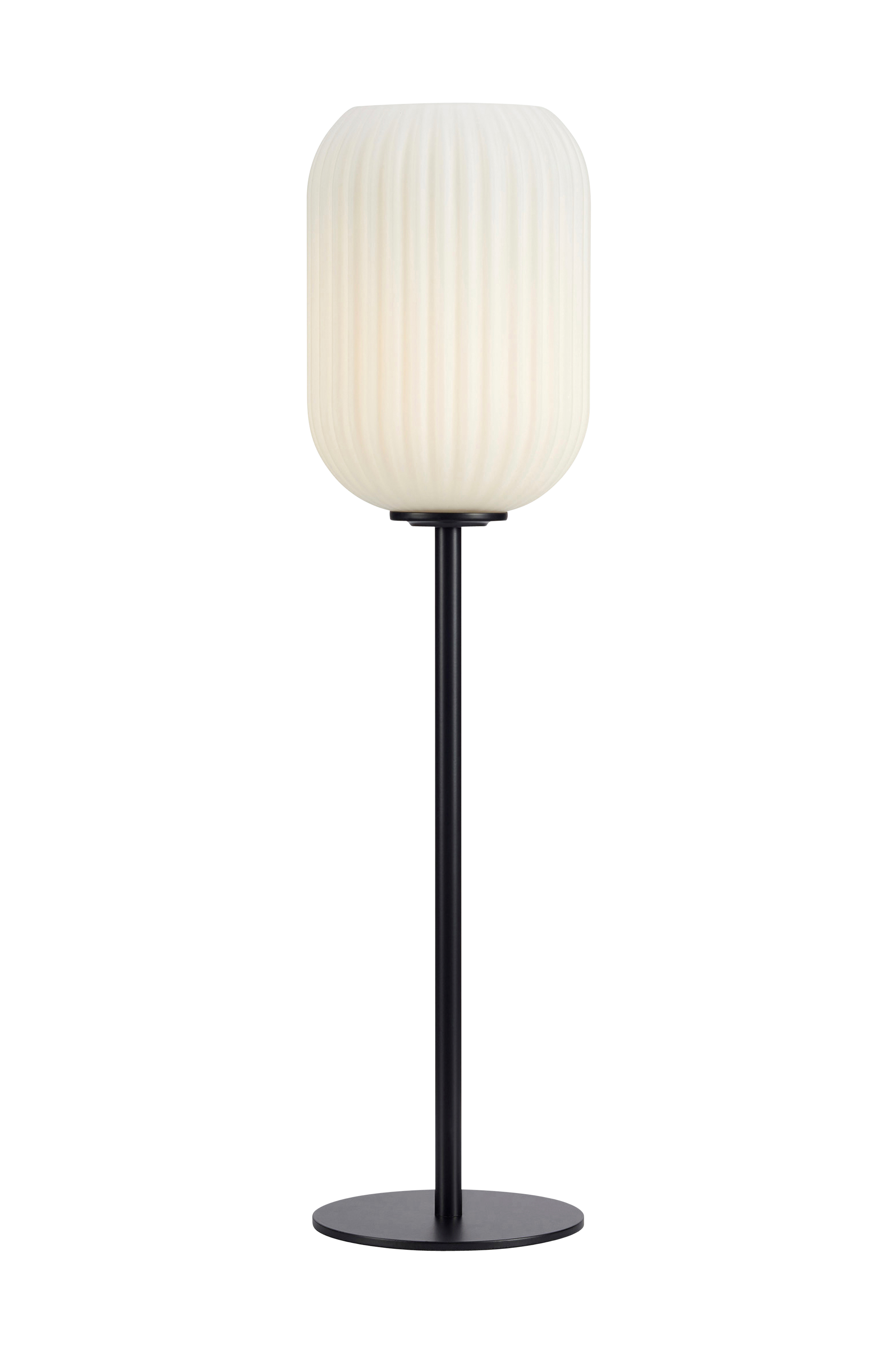 Markslöjdin Cava-pöytävalaisin, jossa metallirunko ja lasivarjostin. 200 cm:n pituinen kangasjohto, jossa katkaisin ja pistoke. Valonlähde ei sisälly toimitukseen.
