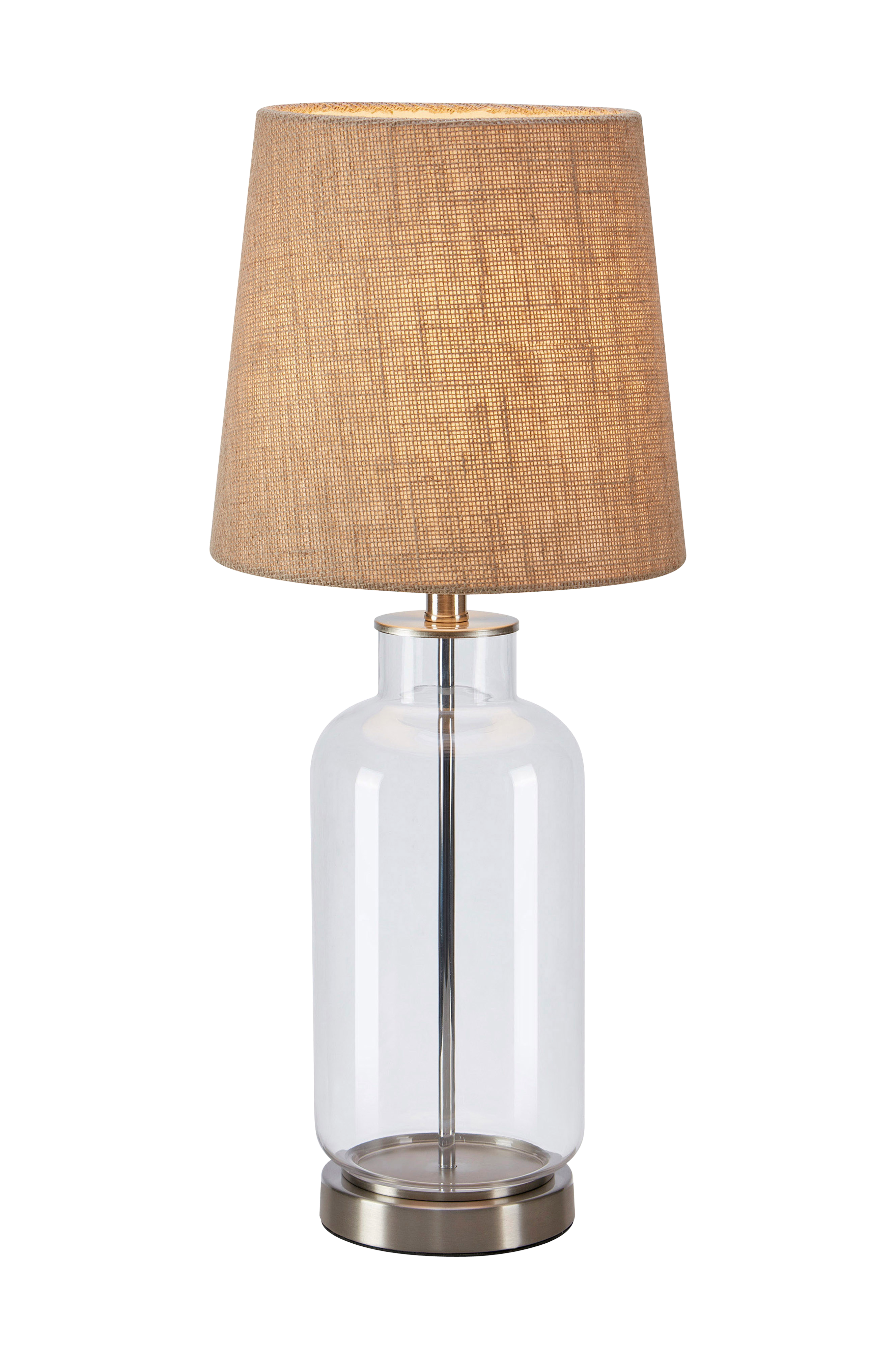 Markslöjdin Costero-pöytävalaisin. Jalka lasia ja metallia, varjostin juuttia. Korkeus 61,5 cm. 2 metrin johto, jossa virtakytkin ja seinäpistoke. 1 x E27, enintään 40 W. Valonlähde ei sisälly toimitukseen.