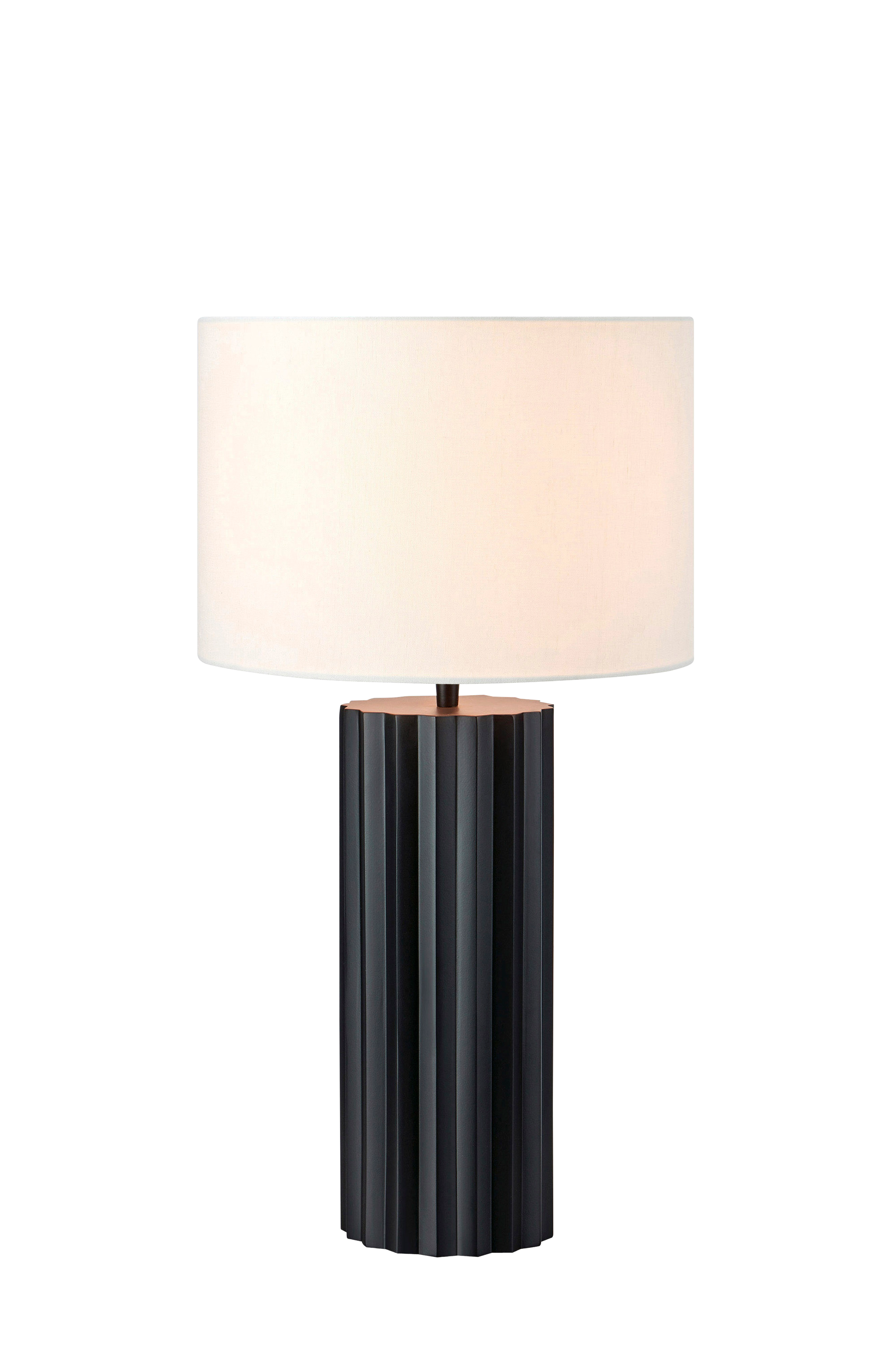Markslöjdin Hashira-pöytävalaisin. Metallijalka ja kangasvarjostin. Korkeus 60 cm. 2,1 metrin kangasjohto, jossa virtakatkaisin ja seinäpistoke. 1 x E27, enintään 40 W. Valonlähde ei sisälly toimitukseen.