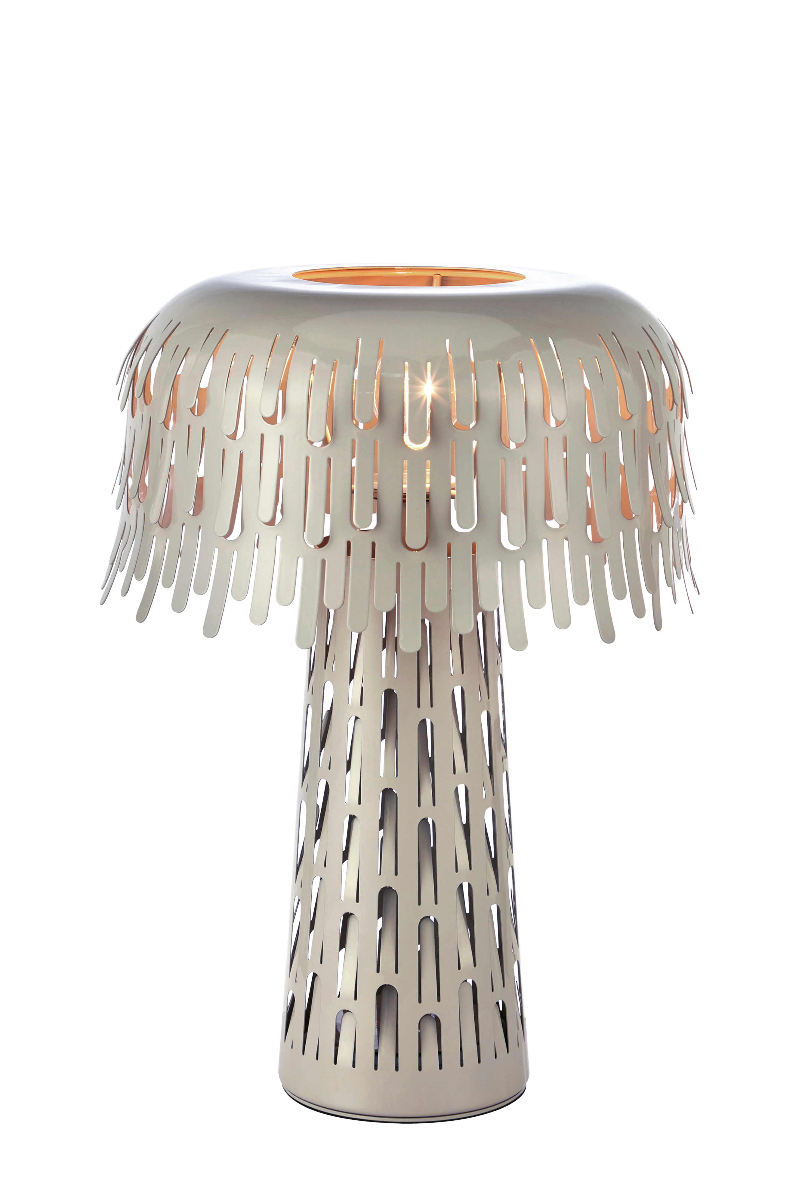 Verbera pöytävalaisin markslöjdiltä. Varjostin ja jalusta värillistä metallia, kiiltävä pinta. Laserleikatut yksityiskohdat antavat valolle hajontaa ja visuaalista rakennetta. 2 m tekstiilikaapeli, jossa kytkin ja seinäpistoke. 1xe14, max 40w. Luokka ii. valonlähde ei sisälly.