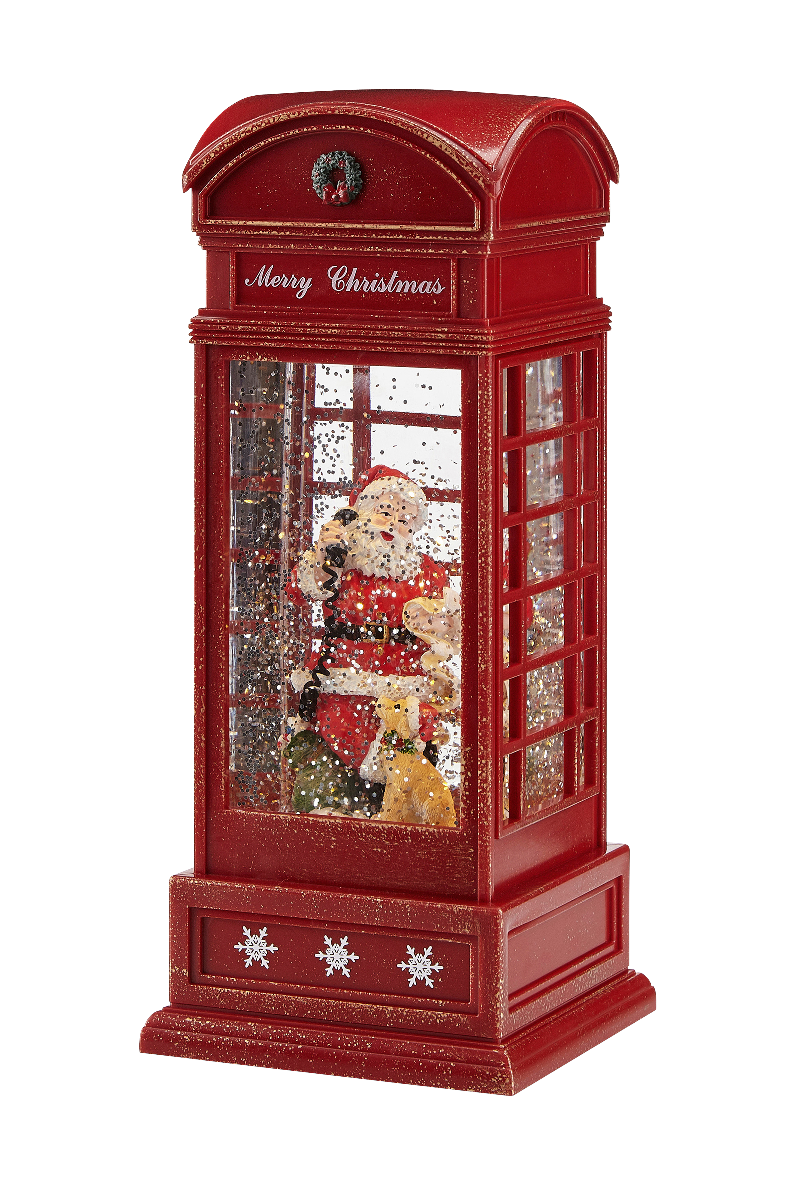 Markslöjdin Mister-puhelinkoppilyhty. Joulupukki ja lumi. Muovia. 1 integroitu valonlähde, jossa lämpimän valkoinen valo, enintään 0,06 W. Toimii kolmella AA-paristolla. Tilaa paristot erikseen. Virtakatkaisin/ajastin kioskissa.