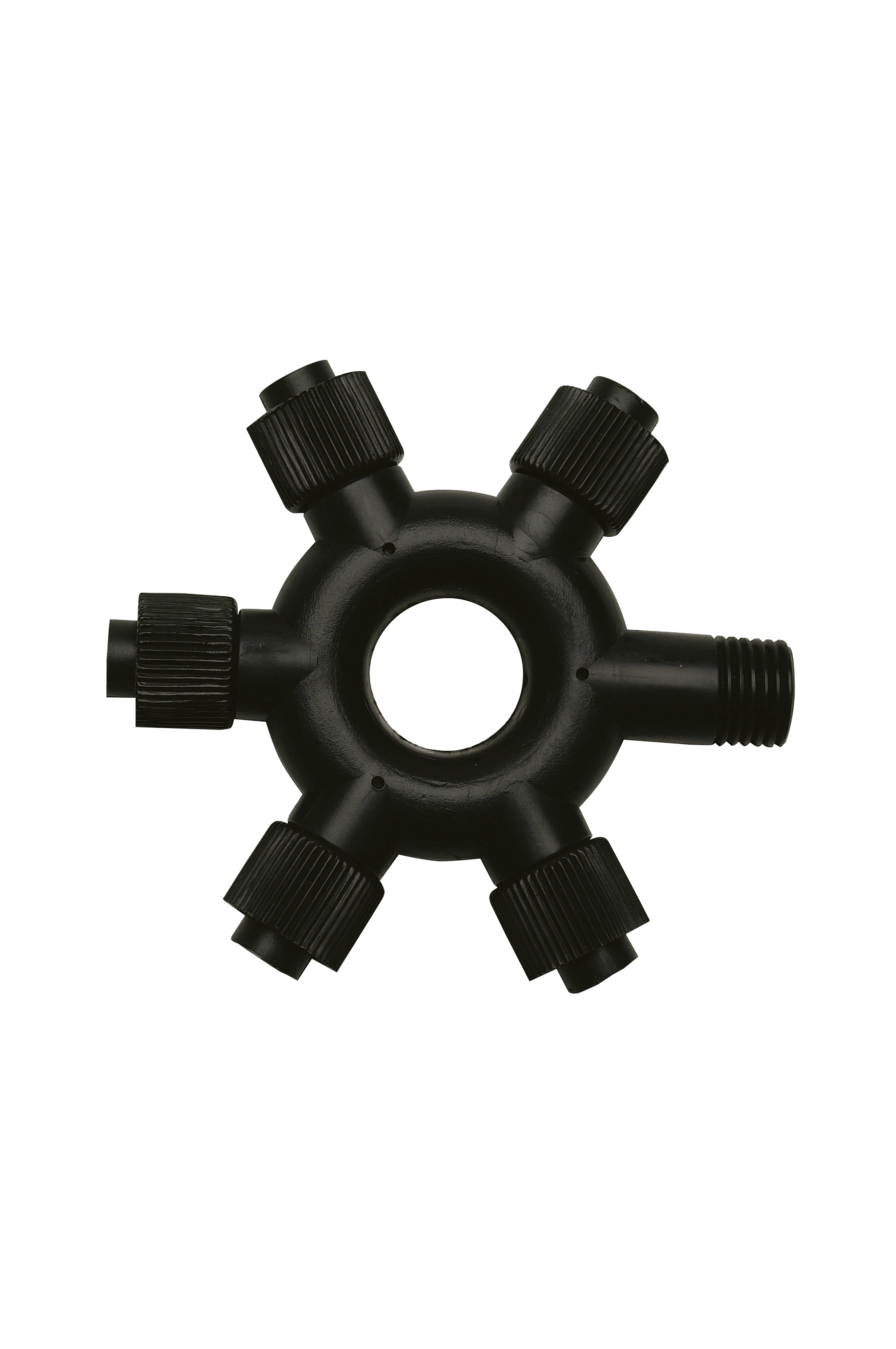 Markslöjdin Chrissline-rengasliitin. Käytetään virran jakamiseen jopa viiteen suuntaan. Muovisessa liittimessä on yksi tulo ja viisi lähtöä. IP44