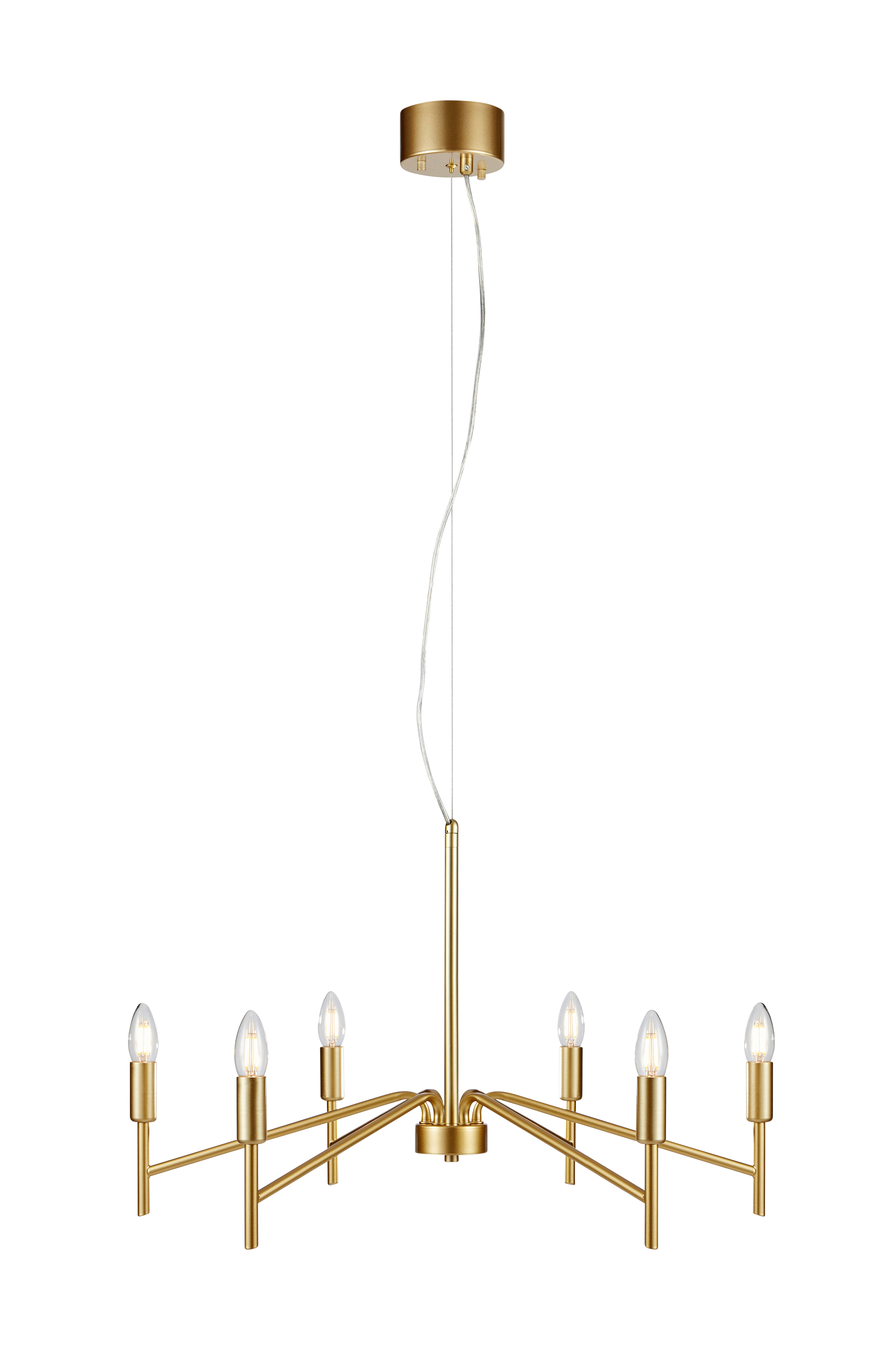 Monarch-riippuvalaisin metallia. 1,5 metrin läpikuultava johto muovia ja vaijeri. Valaisimen halkaisija 70 cm. Asennetaan kattokoukkuun. Metallinen kattokuppi. 6 x E14-lampunkanta. Enintään 18 W. Valonlähteet eivät sisälly toimitukseen.