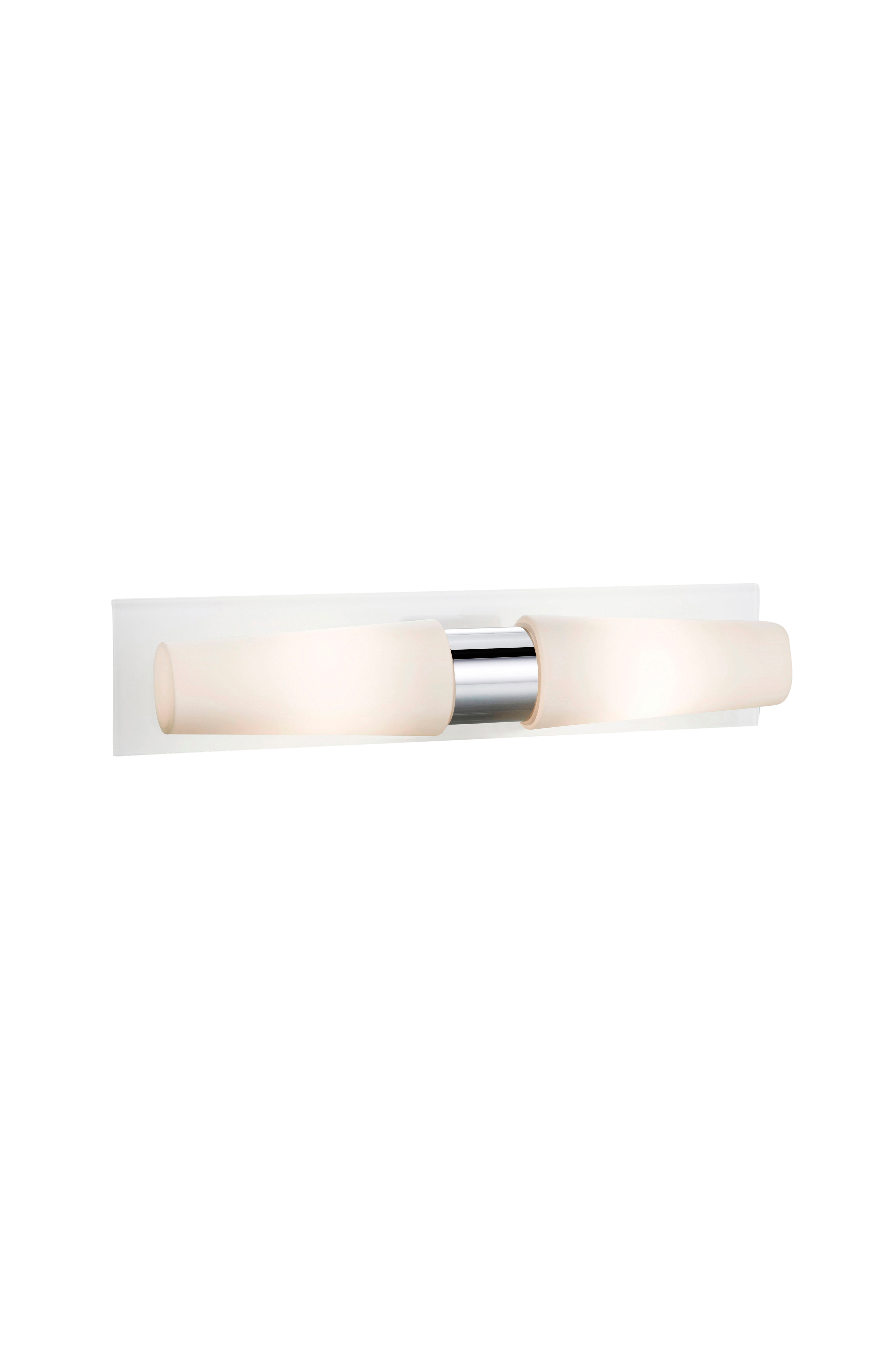 Seinävalaisin kylpyhuoneeseen. Valkoista metallia ja kaksi valkoista lasikupua. IP44. Enintään 2x40 W. E14-lampunkanta. Korkeus 11,5, syvyys 9, leveys 40 cm.