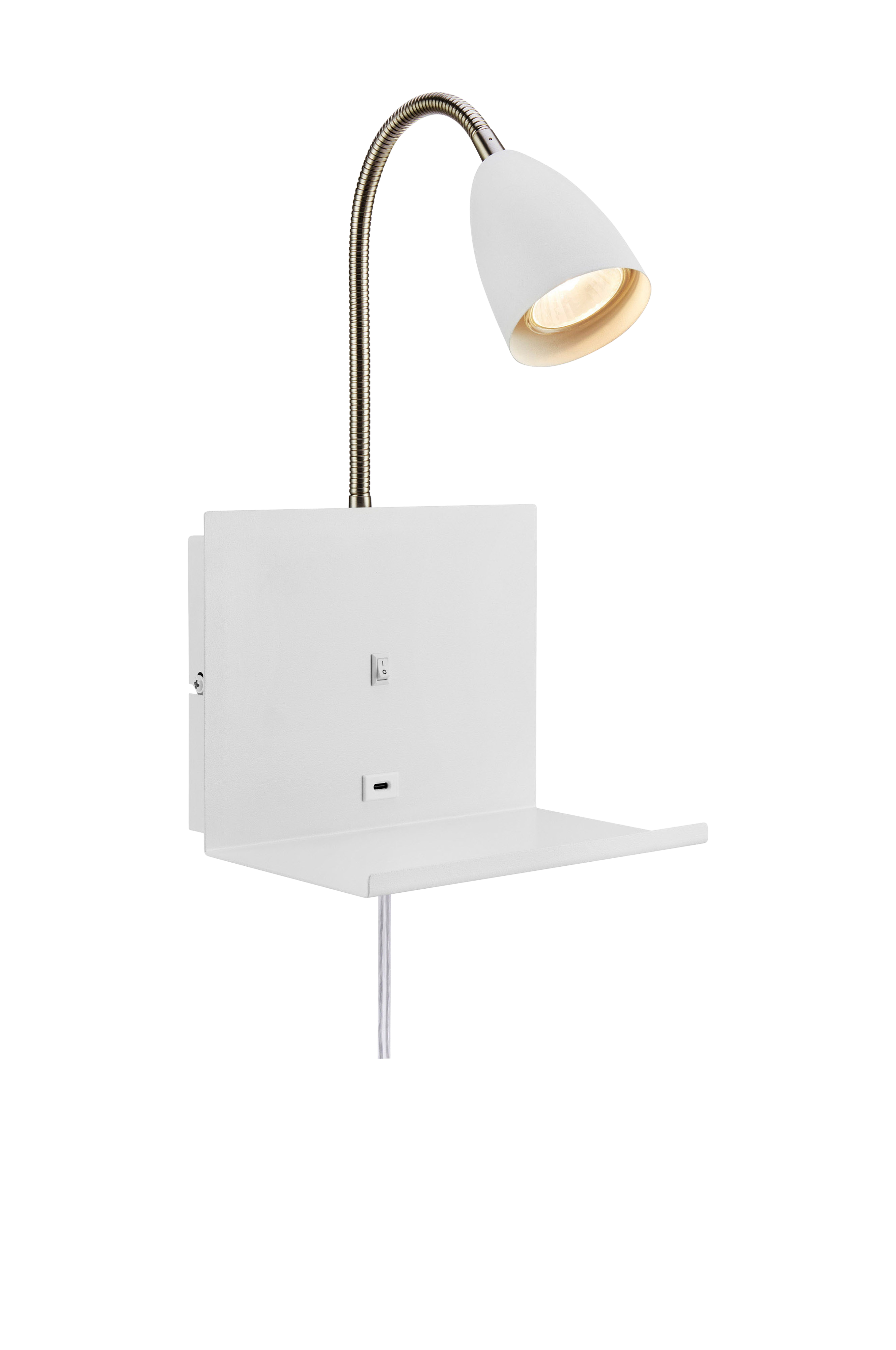 Cuarto seinävalaisin markslöjdiltä. Metallinen seinävalaisin. Joustava lukulamppu. Sisäänrakennettu kytkin. 2 m läpinäkyvä pvc-kaapeli seinäpistokkeella. Asennetaan kiinnikkeellä. Usb-c pistorasia elektronisten laitteiden lataamista varten. Liitäntärasia seinälevyssä, helppo asentaa suoraan tulevan sähkön päälle. 1xgu10, max 7w. Luokka ii. Valonlähde ei sisälly.
