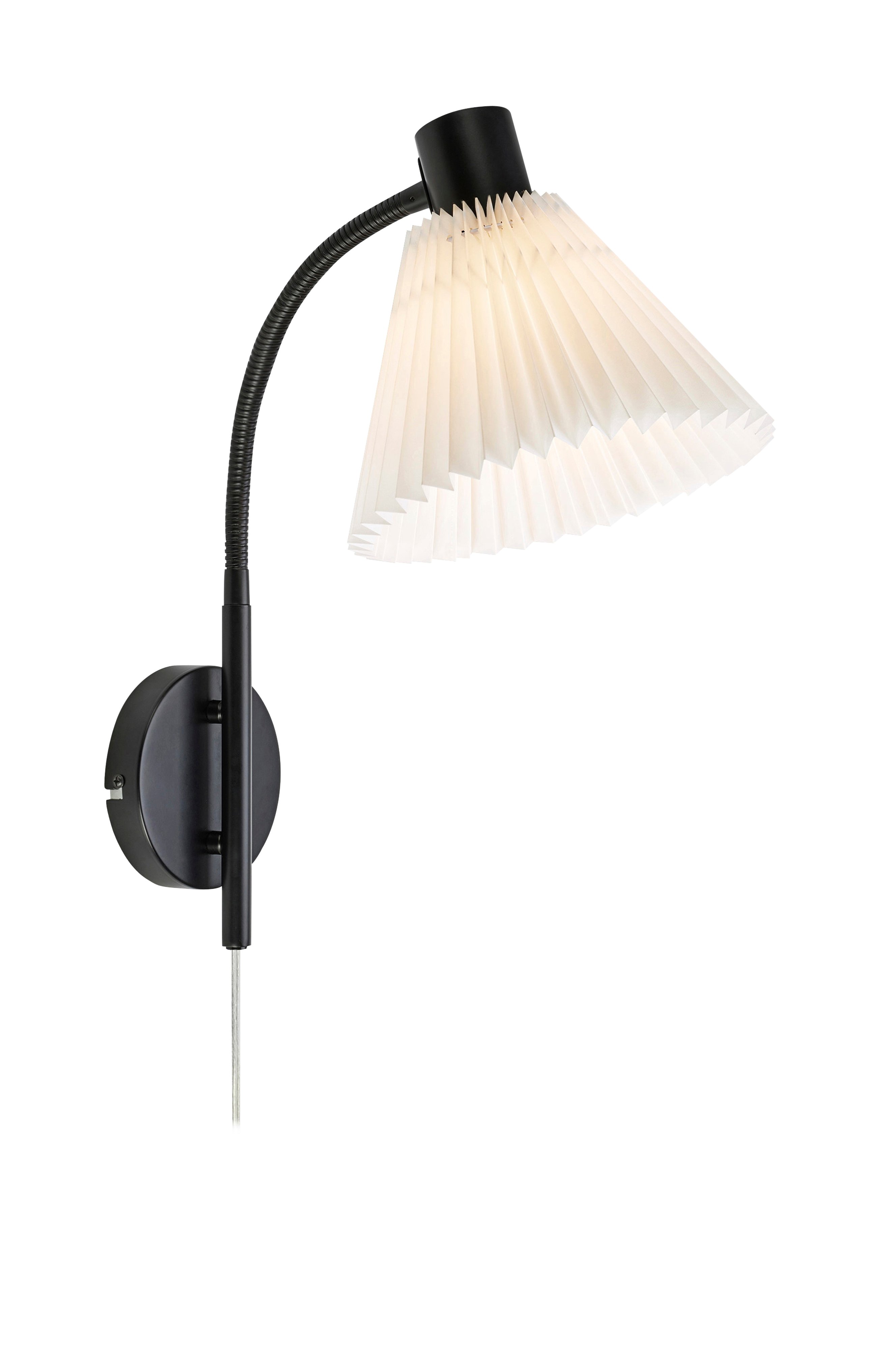 Mira seinävalaisin markslöjdiltä. Jalusta mustaa metallia ja varjostin valkoista laskostettua tekstiiliä. 2 m läpinäkyvä pvc-kaapeli seinäpistokkeella. Kytkin valaisimen päässä. Asennetaan kiinnikkeeseen. 1xe14, max 40w. Valonlähde ei sisälly.
