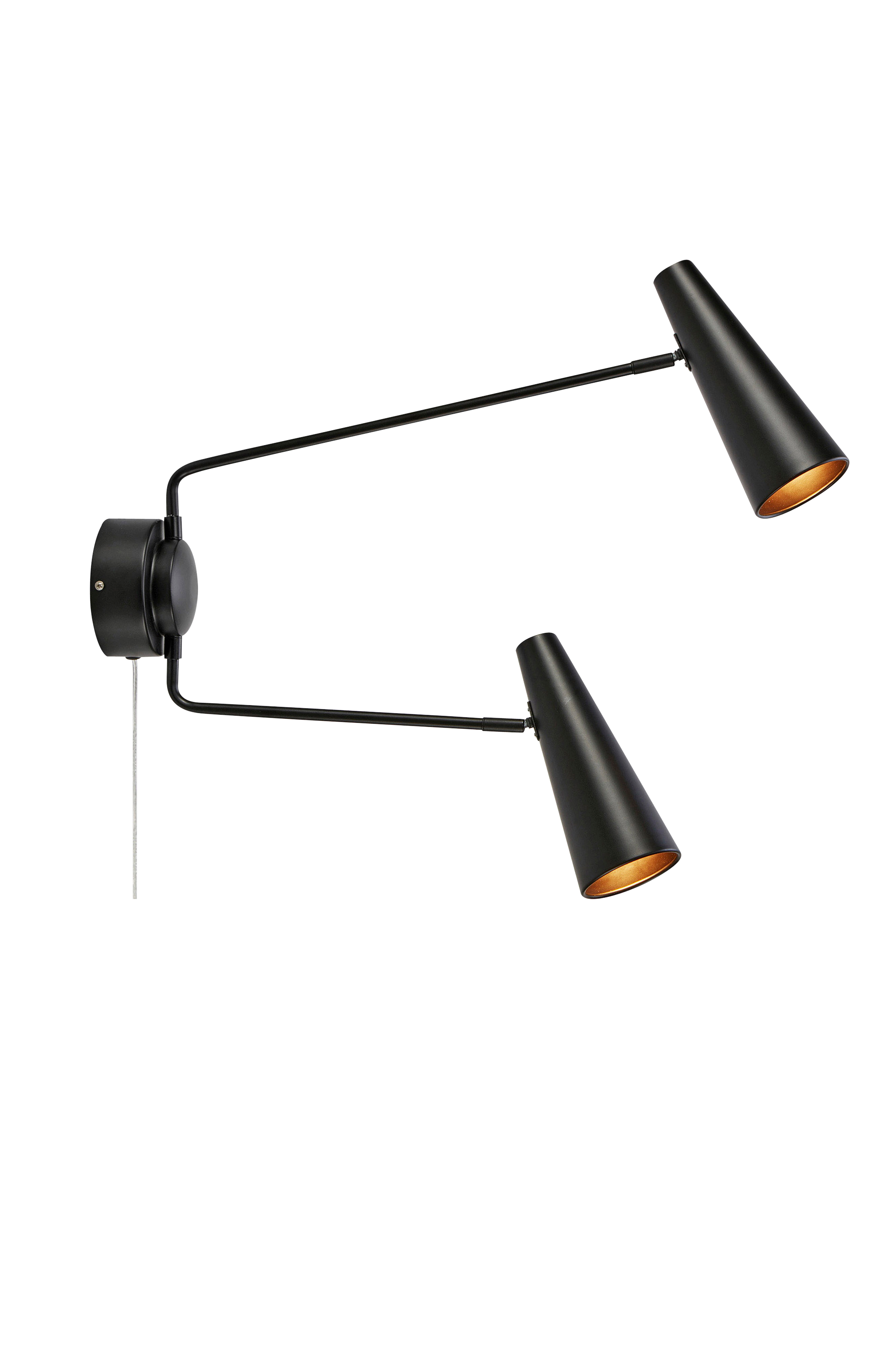 Markslöjdin Peak-seinävalaisin. Runko ja varjostimet metallia. Suunnattavat varjostimet. 2 metrin johto, jossa seinäpistoke. Virtakatkaisin kummassakin lampunvarjostimessa. Asennetaan kiinnikkeen avulla. 2 x E14, enintään 40 W. Valonlähteet eivät sisälly toimitukseen.
