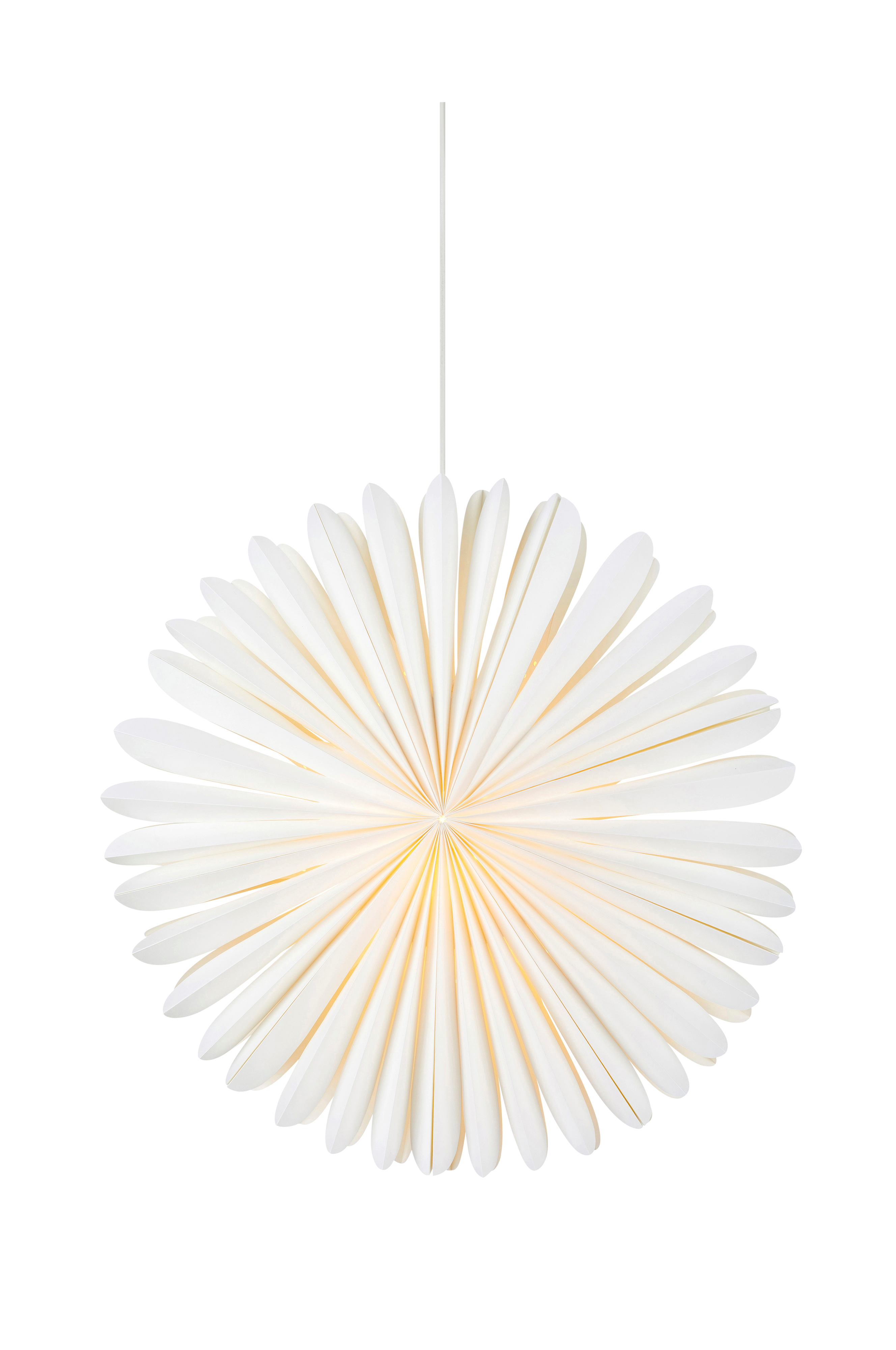 Riippuva paperitähti, jossa kaunis varjostin. Halkaisija 60 cm ja syvyys 17 cm. Ihanan lämmin valo luo täydellisen joulutunnelman. Paperitähti toimitetaan ilman lisätarvikkeita. Ripustusta varten tarvitaan ripustussarja. Pieni lampunkanta (E14). Enintään 25 W:n lamppu tai vastaava LED-lamppu, ei mukana.