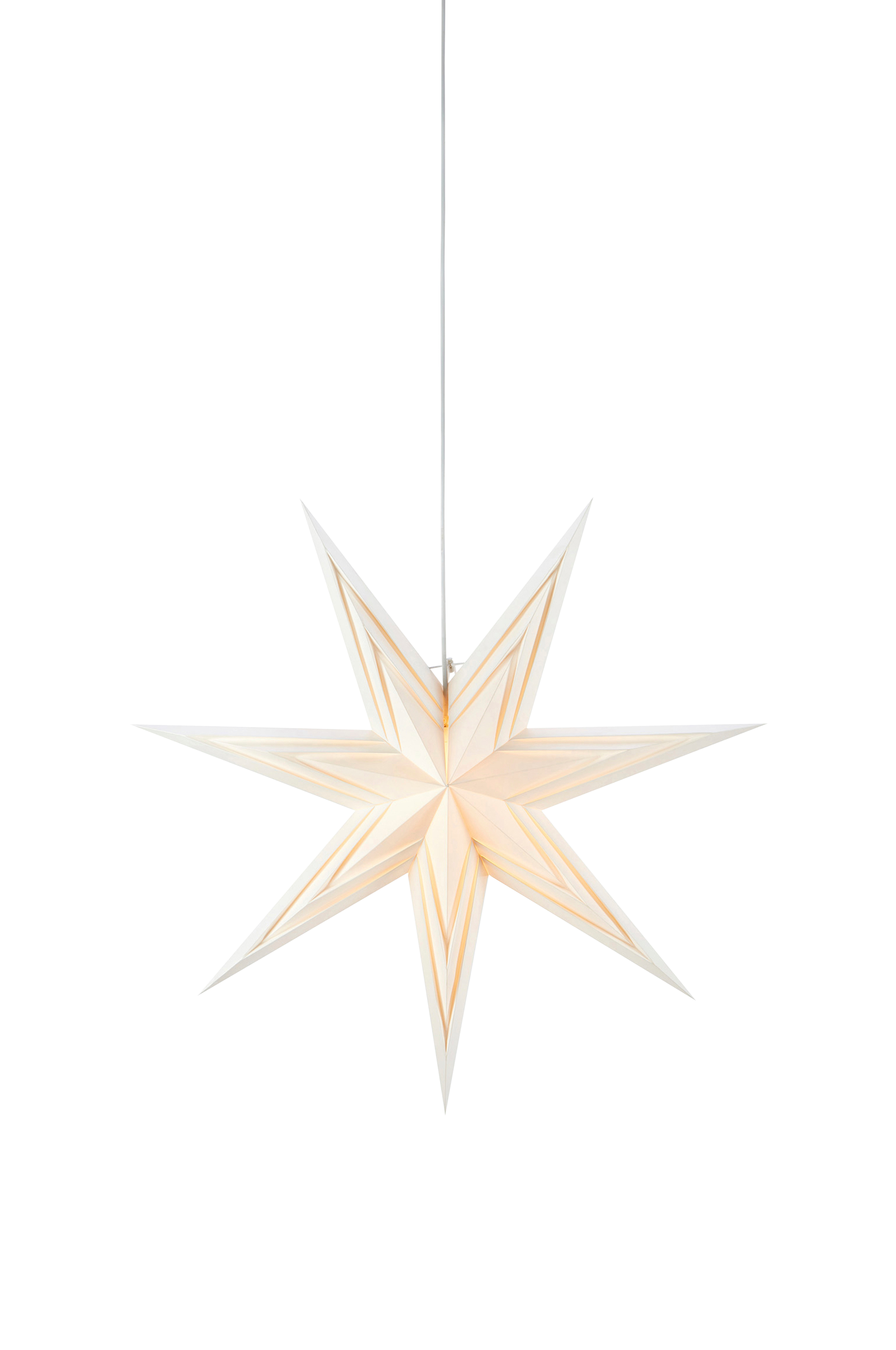 Markslöjdin riippuva Sombra-valotähti. Paperitähti on 70 cm. 3,5 m:n valkoinen PVC-johto, jossa virtakytkin johdossa ja seinäpistoke. 1xE14-lampunkanta, enintään 6 W LED. Valonlähde ei sisälly toimitukseen.