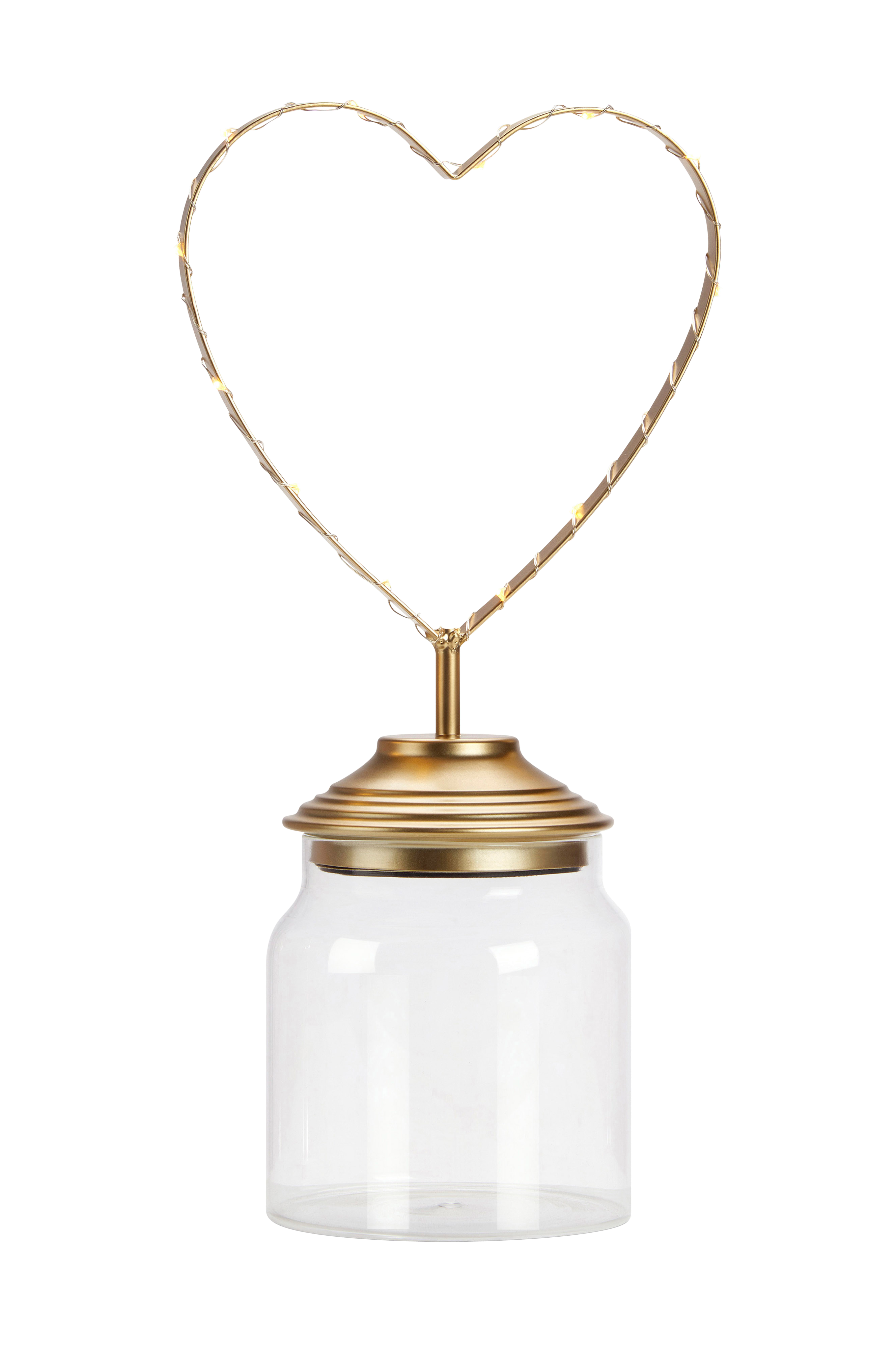 Lasipurkki, jonka kannessa kullanvärinen sydänkoriste. Täytä purkki esimerkiksi joulunameilla tai pähkinöillä. Sydämen ympärille on kierretty LED-valoköynnös, jossa on 15 valopistettä. Toimii 3xAA-paristoilla. (Tilaa paristot erikseen.) Virtakytkin paristolaatikossa. Täydellinen lahja! Leveys 17,5 cm, syvyys 12 cm ja korkeus 35 cm.