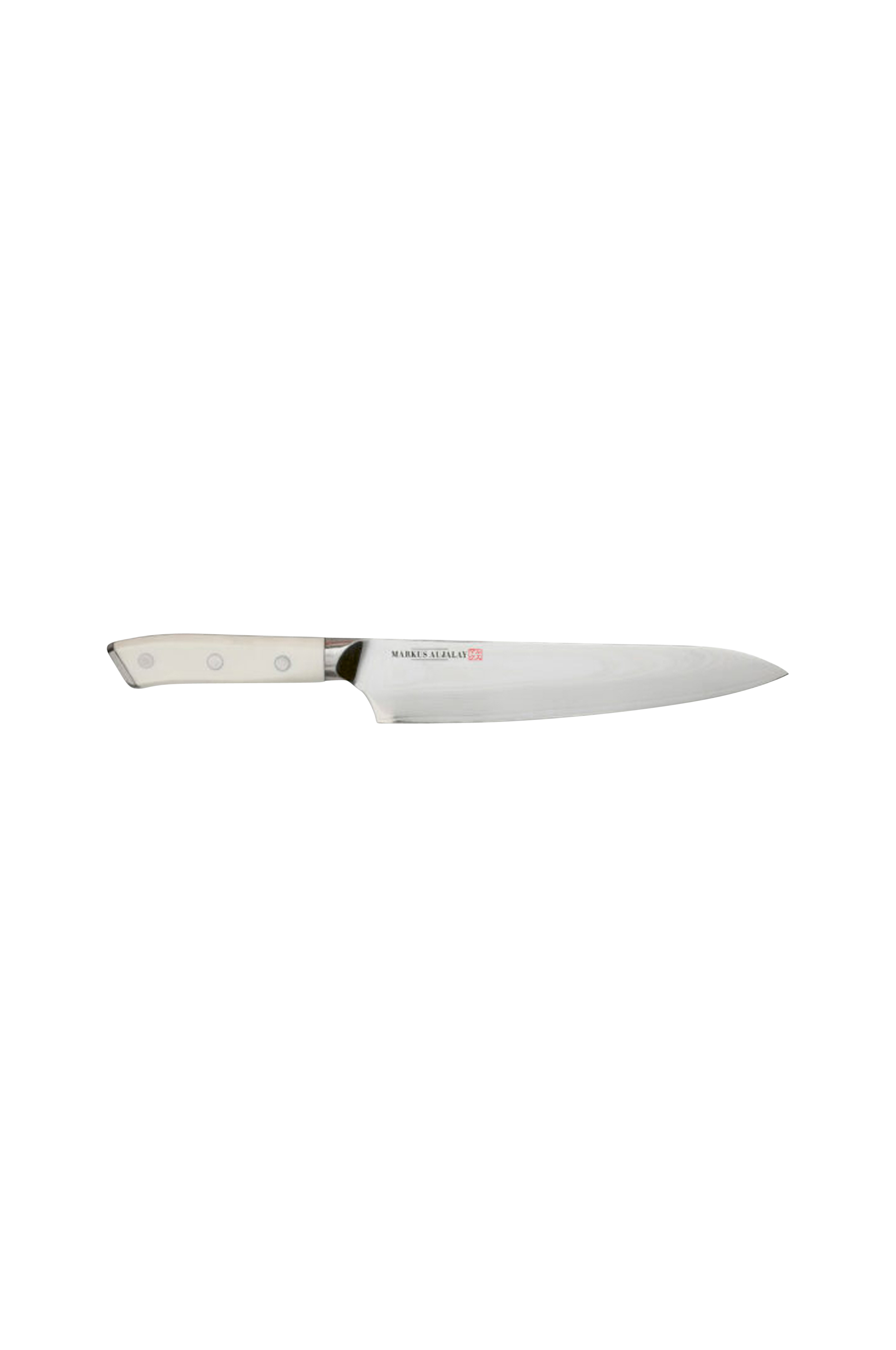 Ylellinen ja terävä kokkiveitsi, jonka terä on valmistettu 67-kerroksisesta teräksestä, joka on taottu ja kiillotettu ainutlaatuisen veitsen luomiseksi. Ydin on kovaa terästä ja muut kerrokset pehmeämpää, ruosteenkestävää terästä, joka on erittäin terävää. Veitsen valkoinen kahva on kestävä ja suunniteltu antamaan parhaan mahdollisen otteen.