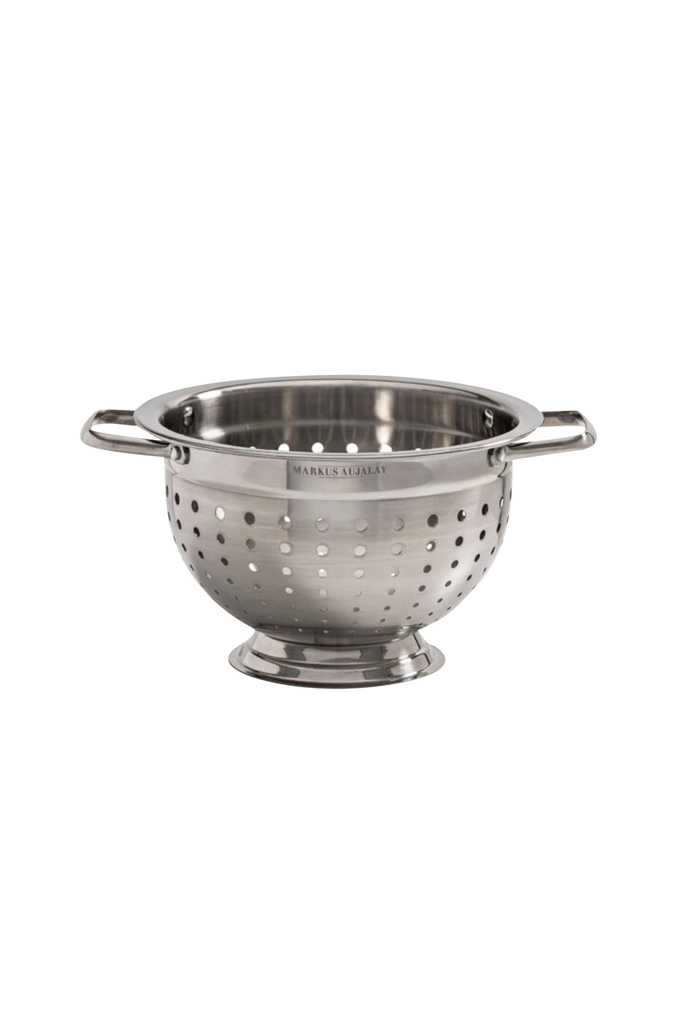 Ylellinen siivilä laadukas ruostumatonta 18/10-terästä. Ajaton muotoilu, jossa kestävät kahvat. Markus Aujalay -logo tyylikäästi kaiverrettuna sivulla.