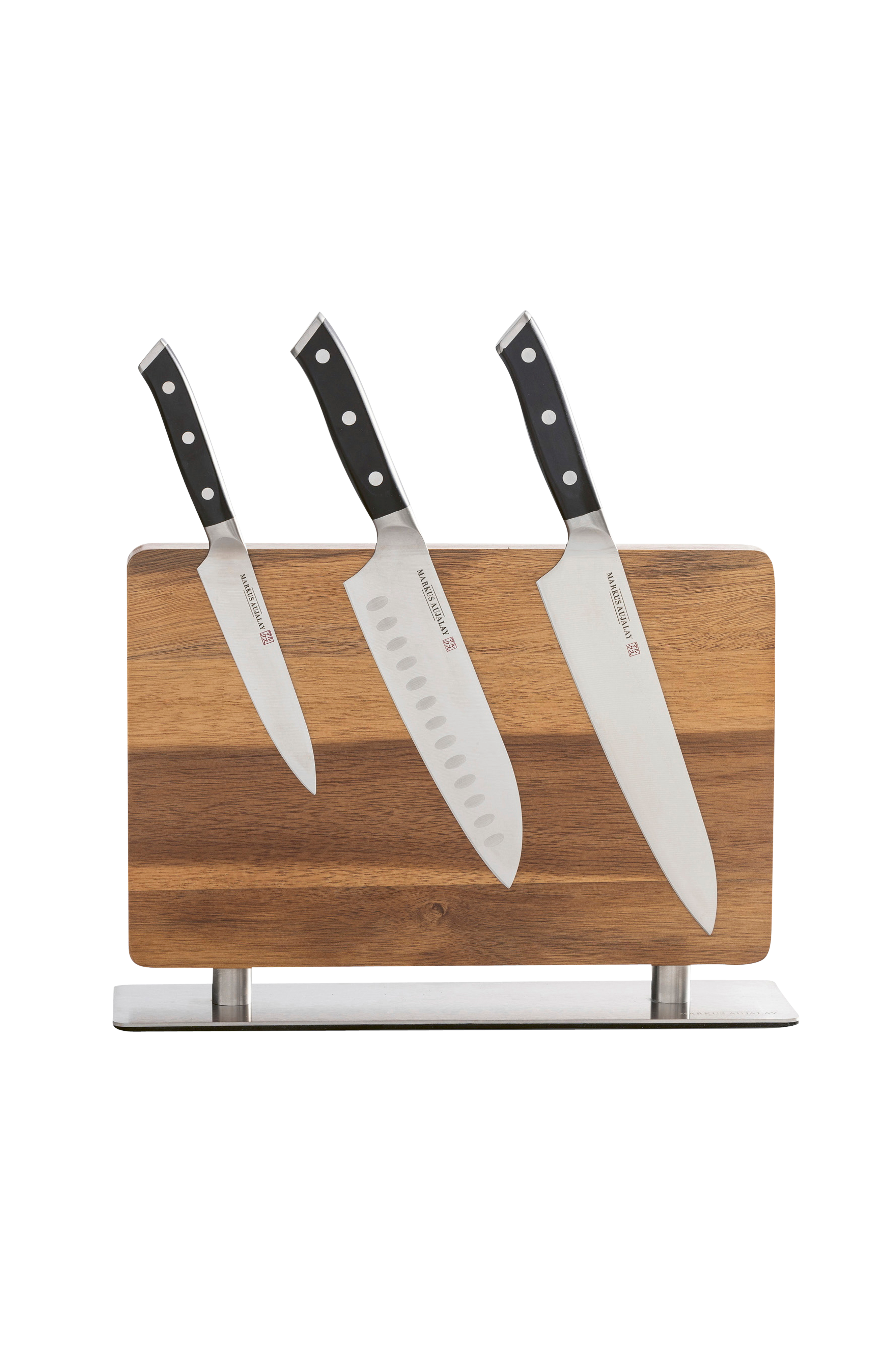 Erittäin eksklusiivinen akaasiapuusta valmistettu veitsilohko jopa 12 veitselle. Kiinnitä vain magneettilohkon molemmille puolille! Jos säilytät veitset hyvin, se pidentää veitsien käyttöikää huomattavasti. Veitset kestävät parhaiten, jos ne säilytetään veitsilohkossa eikä keittiön laatikossa, jossa ne ovat vaarassa törmätä toisiinsa tai muihin astioihin. Lisäksi ne ovat helposti saatavilla, kun tarvitset niitä! Koko: korkeus 24 cm, leveys 34 cm, syvyys 10 cm. Toimitetaan värillisessä laatikossa. (veitset eivät sisälly pakkaukseen).