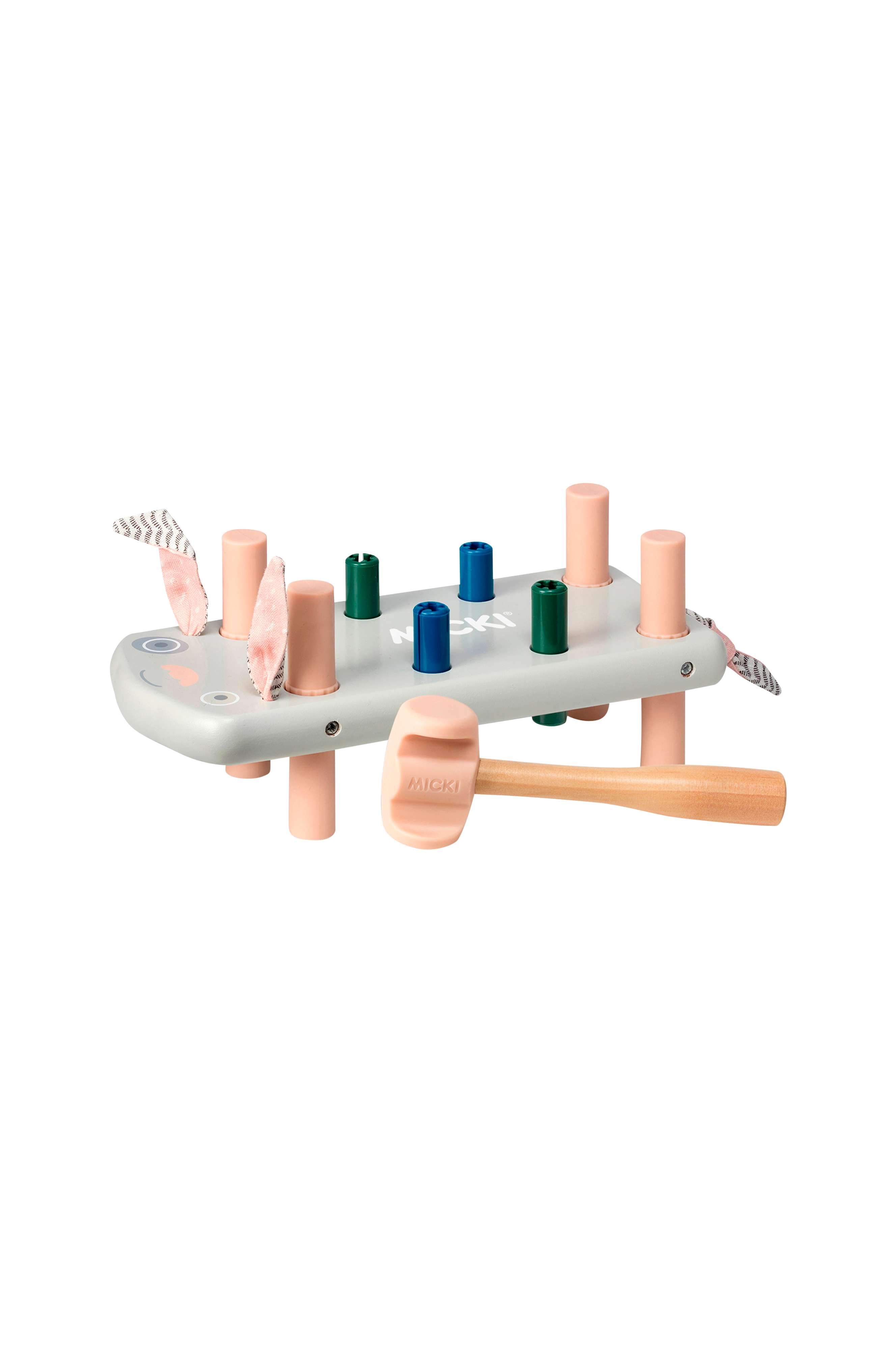 Klassinen puinen hakkalelu, joka on sekä hauska että kehittää lapsen koordinaatiota ja motoriikkaa. Veikeä muotoilu muistuttaa suloista porsasta! Leikkisät värit ja erilaiset luonnonmateriaalit luovat pehmeän vaikutelman, ja lapsi voi käyttää leikissä useita aisteja. Miltä tuntuu porsaan pehmeä kärsä, kun kosket siihen? Ja miltä kuulostaa, kun vasaroit tapit alas? Hakkalelun jalat ovat pehmeää muovia, joka vaimentaa ääntä, tekee hakkalelusta vakaan eikä jätä jälkiä alustaan lapsen lelua vasaroidessa. Myös vasaran pää on pehmeää ja ääntä vaimentavaa muovia, joka ehkäisee jälkien syntymistä.