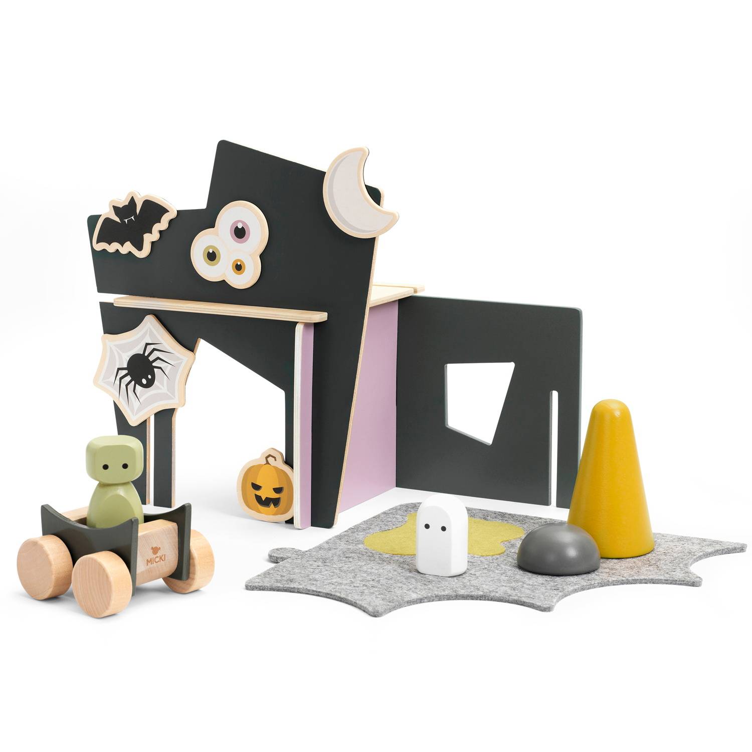 Micki Monster -leikkisetin sisältö: 4 tietä, 2 hahmoa, 1 auto, 1 puu, 1 kivi/pensas, 5 magneettia (kuu, lepakko, kurpitsa, silmiä ja hämähäkinverkko) sekä kaksiosainen huopainen leikkialusta. Tuote kuuluu erilaisista leikkiseteistä koostuvaan sarjaan. Lapsi voi rakentaa ja laajentaa leikkiä yhdistelemällä eri leikkisettejä oman mielensä mukaan. Vain mielikuvitus on rajana! FSC-merkittyä puuta.
