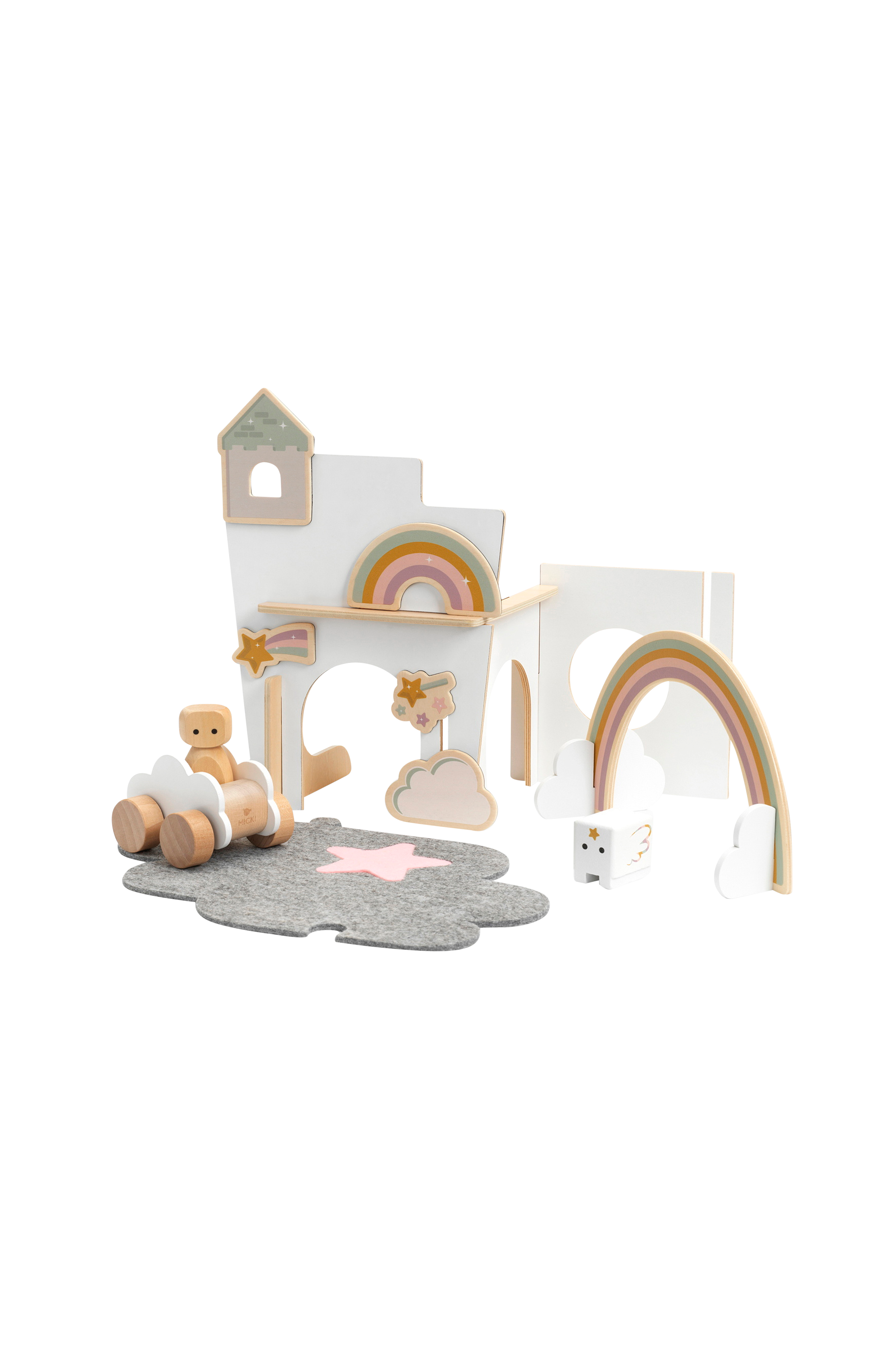 Rakennettavat tiet, leikkialusta, magneettiset etuseinät ja magneetit tarjoavat lapselle oikeat puitteet kehittävän leikin aloittamiseksi iästä riippumatta. Pelkistetyt muodot ja abstraktit hahmot luovat edellytykset oman mielikuvitusmaailman helppoon rakentamiseen - niin pienen kuin isonkin. Leikki saattaa alkaa sateenkaaritalosta ja kehittyä mielikuvituksen myötä vaikka miten suureksi ja millaiseksi tahansa!