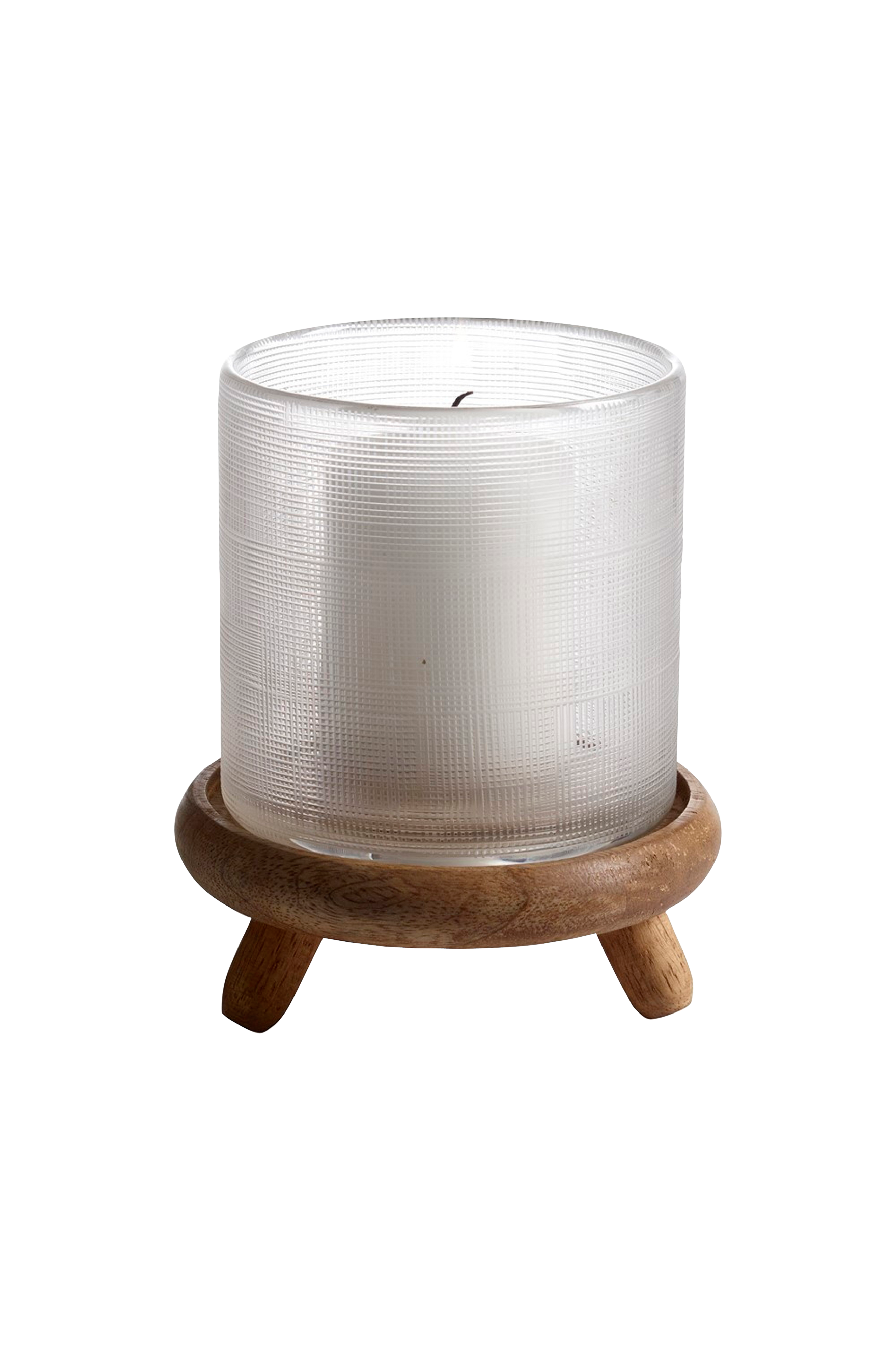 Kynttilälyhty/maljakko struktuuripintaista lasia. Jalustan jalat mangopuuta. Aseta useita eri kokoisia kynttilälyhtyjä ryhmäksi luomaan miellyttävää tunnelmaa. Korkeus 14 cm. Halkaisija 12 cm.