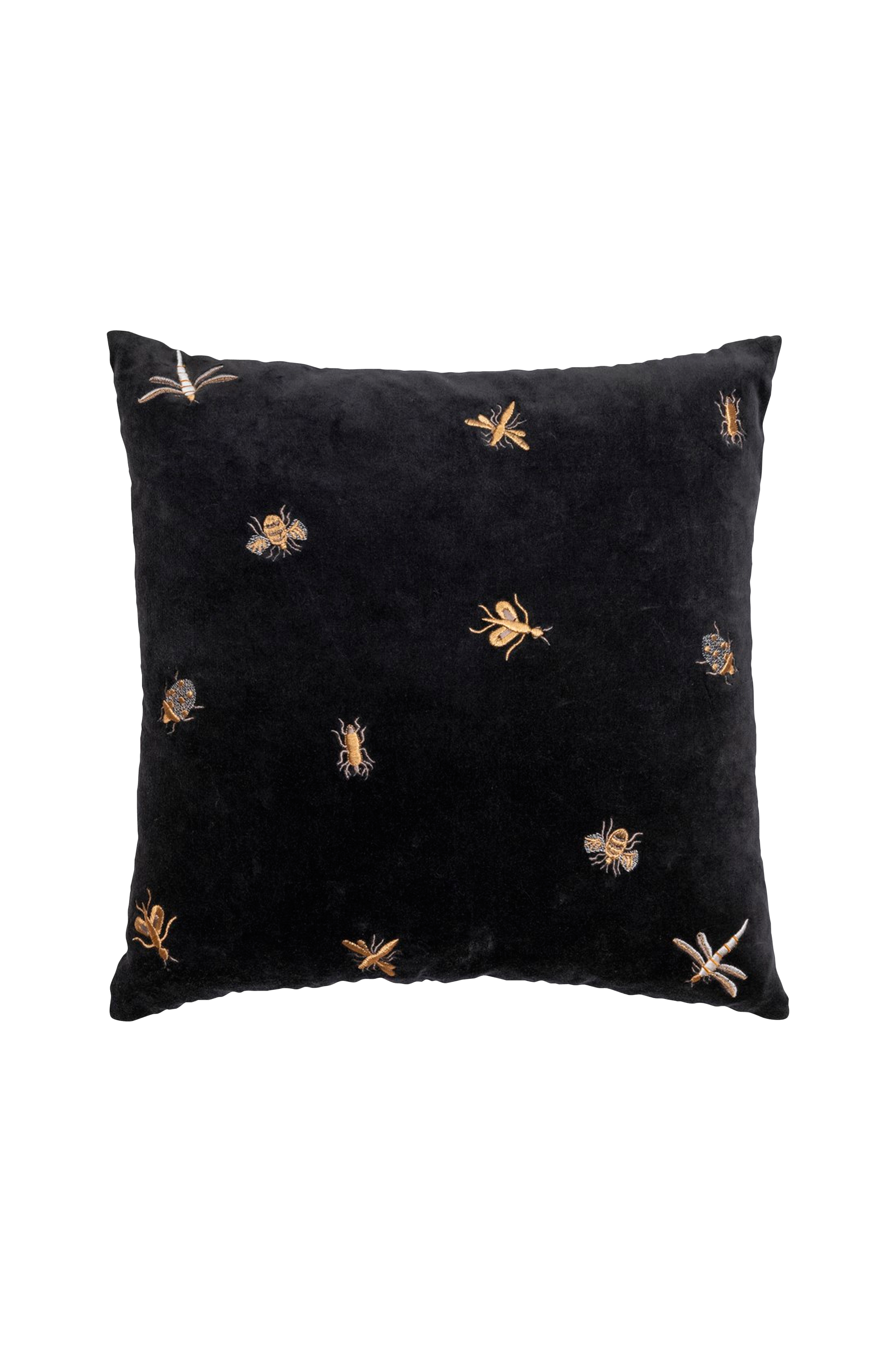 Tyynynpäällinen 100% puuvillasamettia. Etupuoli on koristeltu kullanvärisillä hyönteiskirjailuilla ja takaosa mustaa samettia. Piilovetoketju alareunassa. Koko 45x45 cm. Kemiallinen pesu.