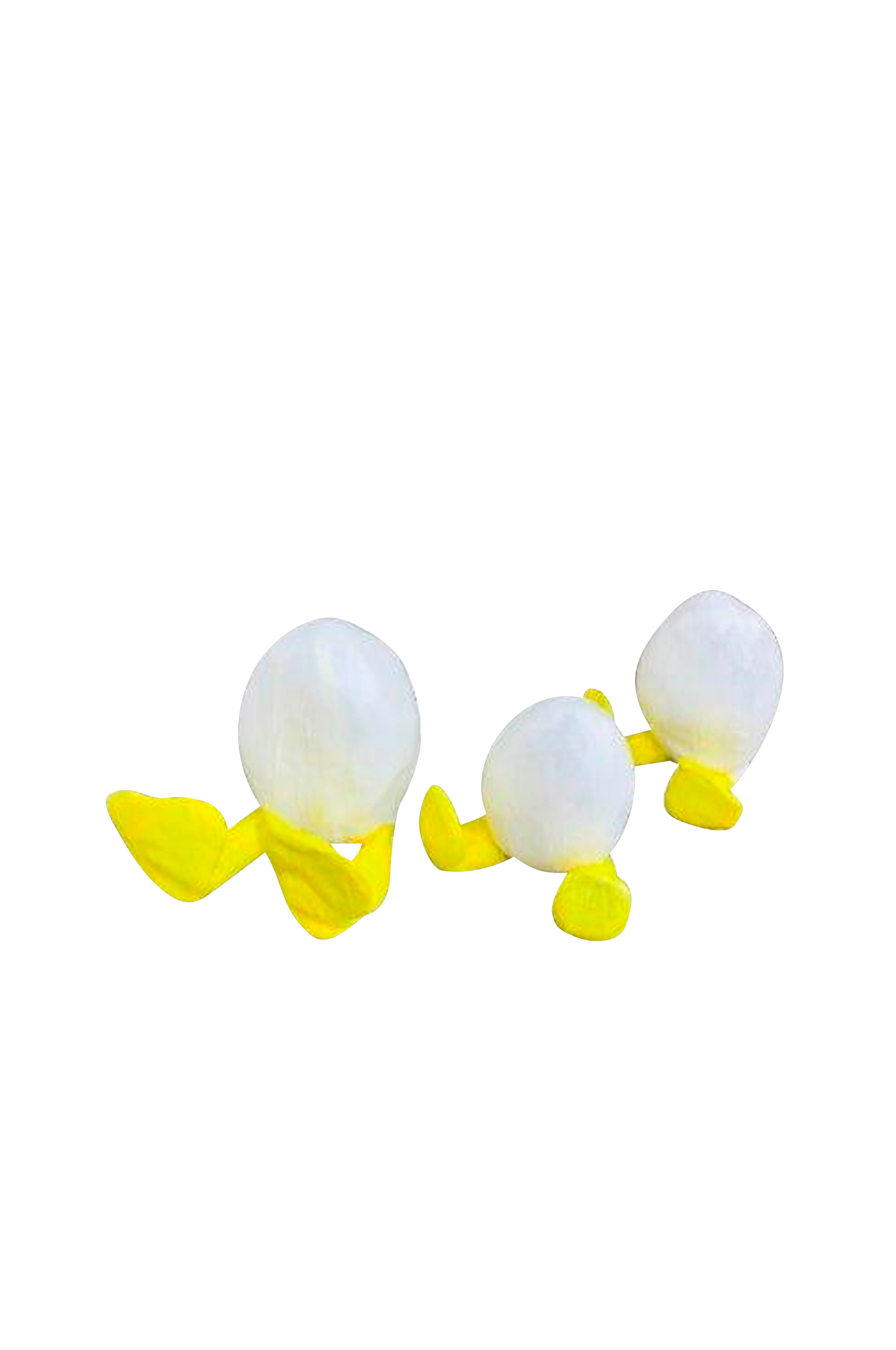 Hienot keramiikkamunat, joilla on isot keltaiset jalat ja ovat suloisia koristeena.