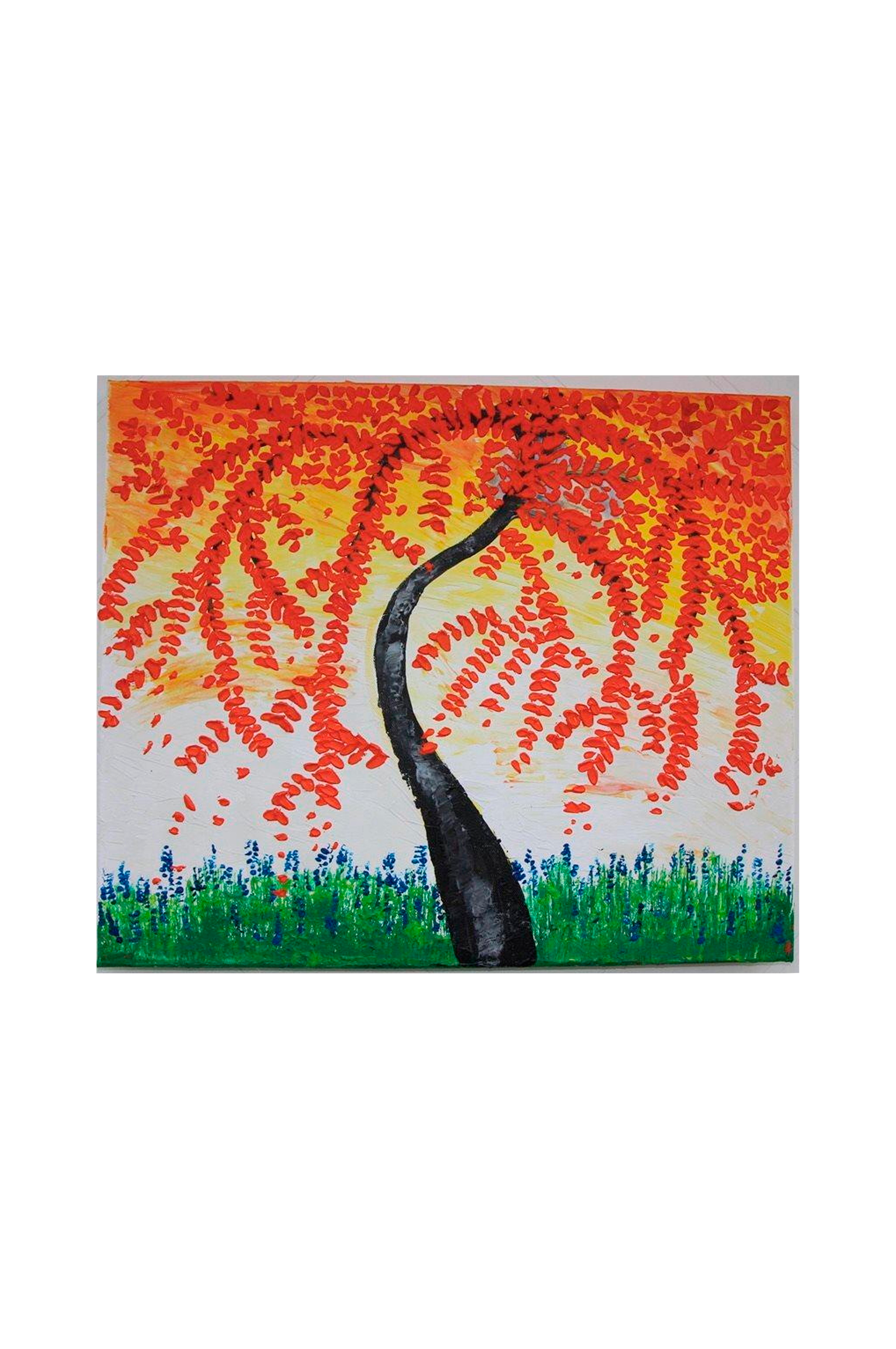 Kukat on maalattu akryylimaalausaineella, mikä luo elävän vaikutelman ja saa kukat nousemaan esiin taustasta.