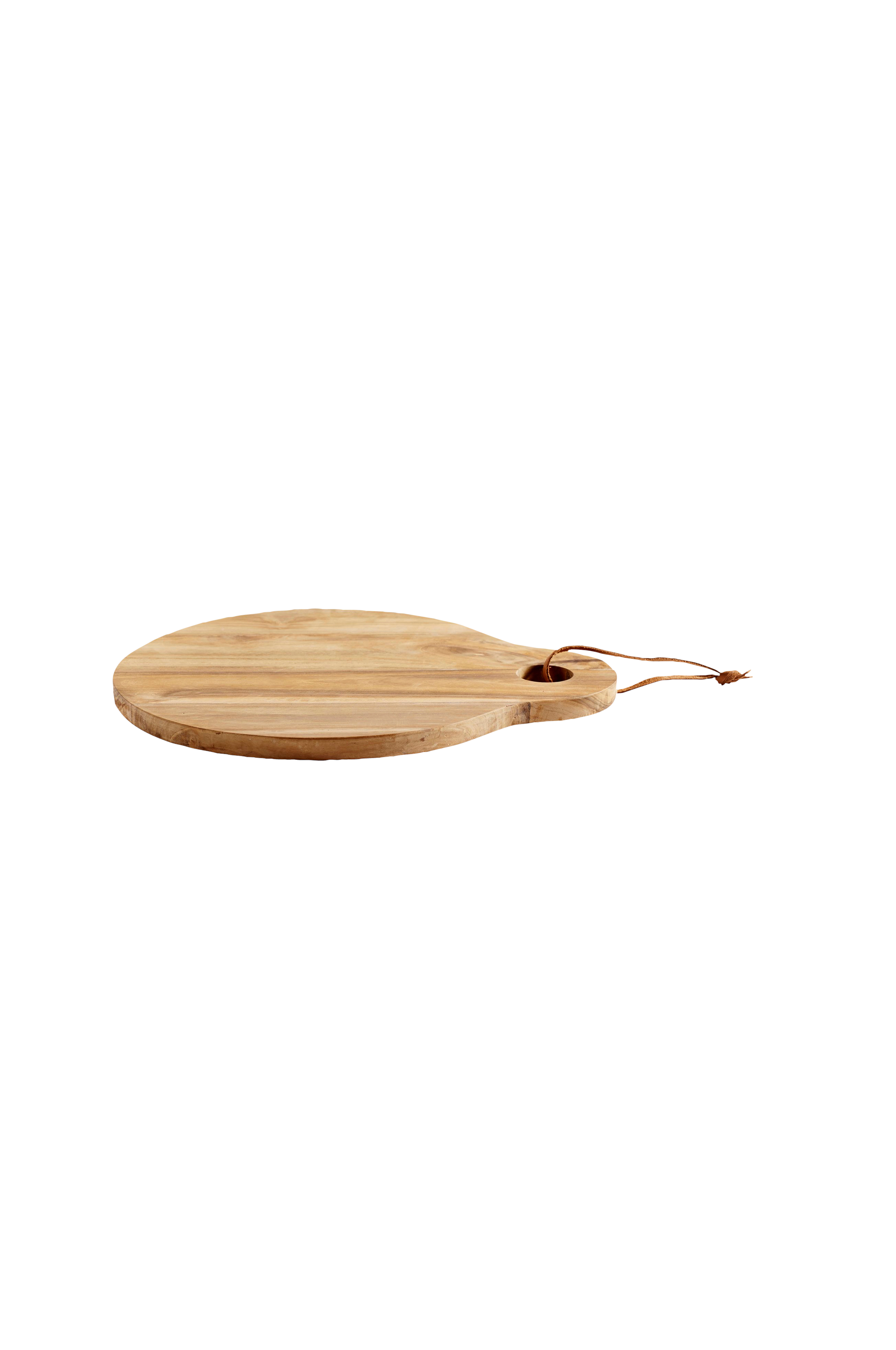 Round Base -leikkuulauta tiikkiä. Sopii hyvin myös tarjoiluvadiksi. Leikkuulautaan on kiinnitetty nahkanauha, josta se voidaan ripustaa koukkuun. Leikkuulauta on luonnontuote, joten puun väri ja rakenne voivat vaihdella. Kiillon ja värin säilyttämiseksi pinta voidaan käsitellä ruokaöljyllä.
