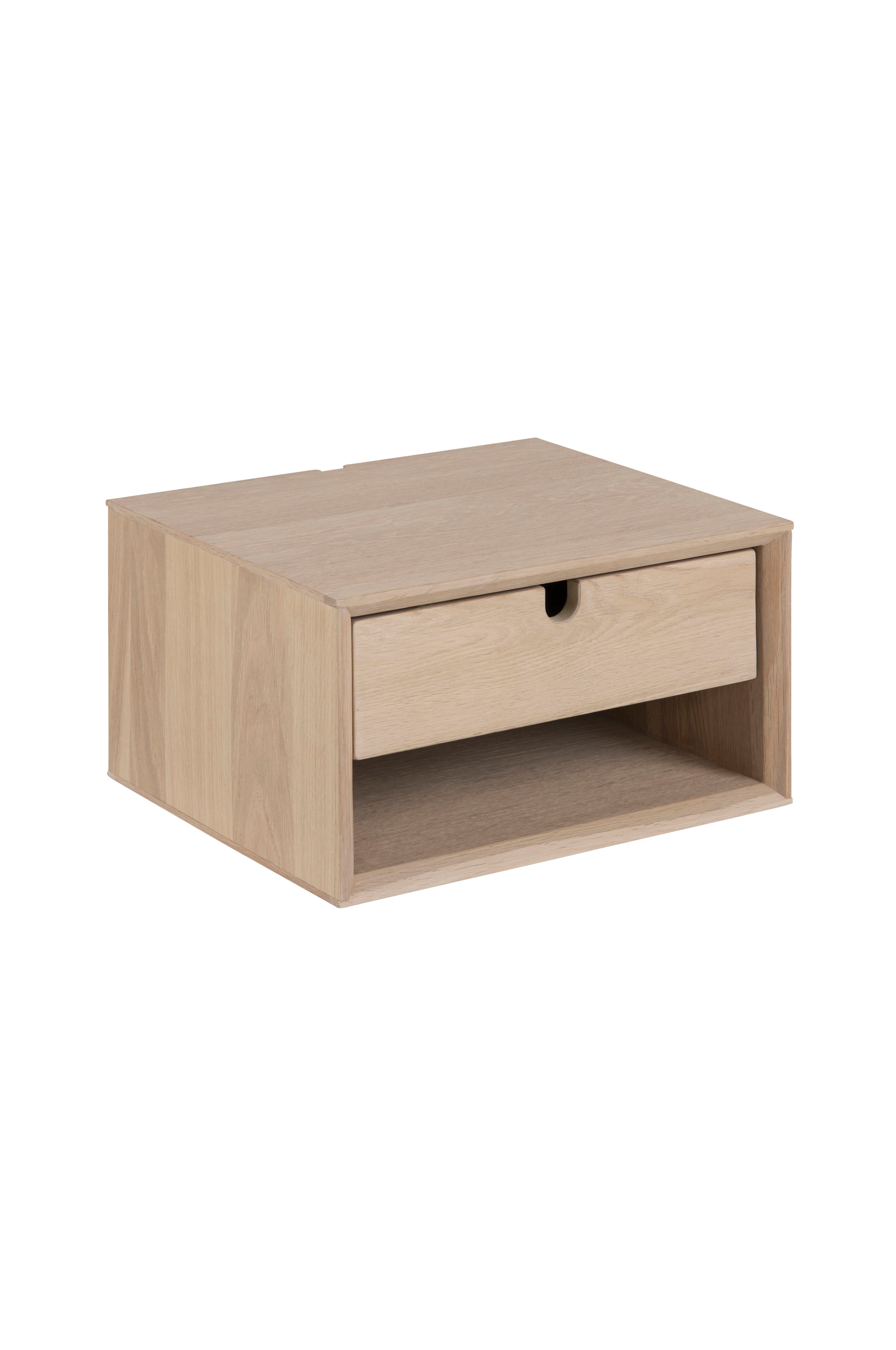 Yöpöytä/hylly. Valkopigmentoitua tammiviilua. 1 laatikko. Asennetaan seinään. Leveys 37 cm, syvyys 32 cm, korkeus 21 cm. Toimitetaan koottuna.