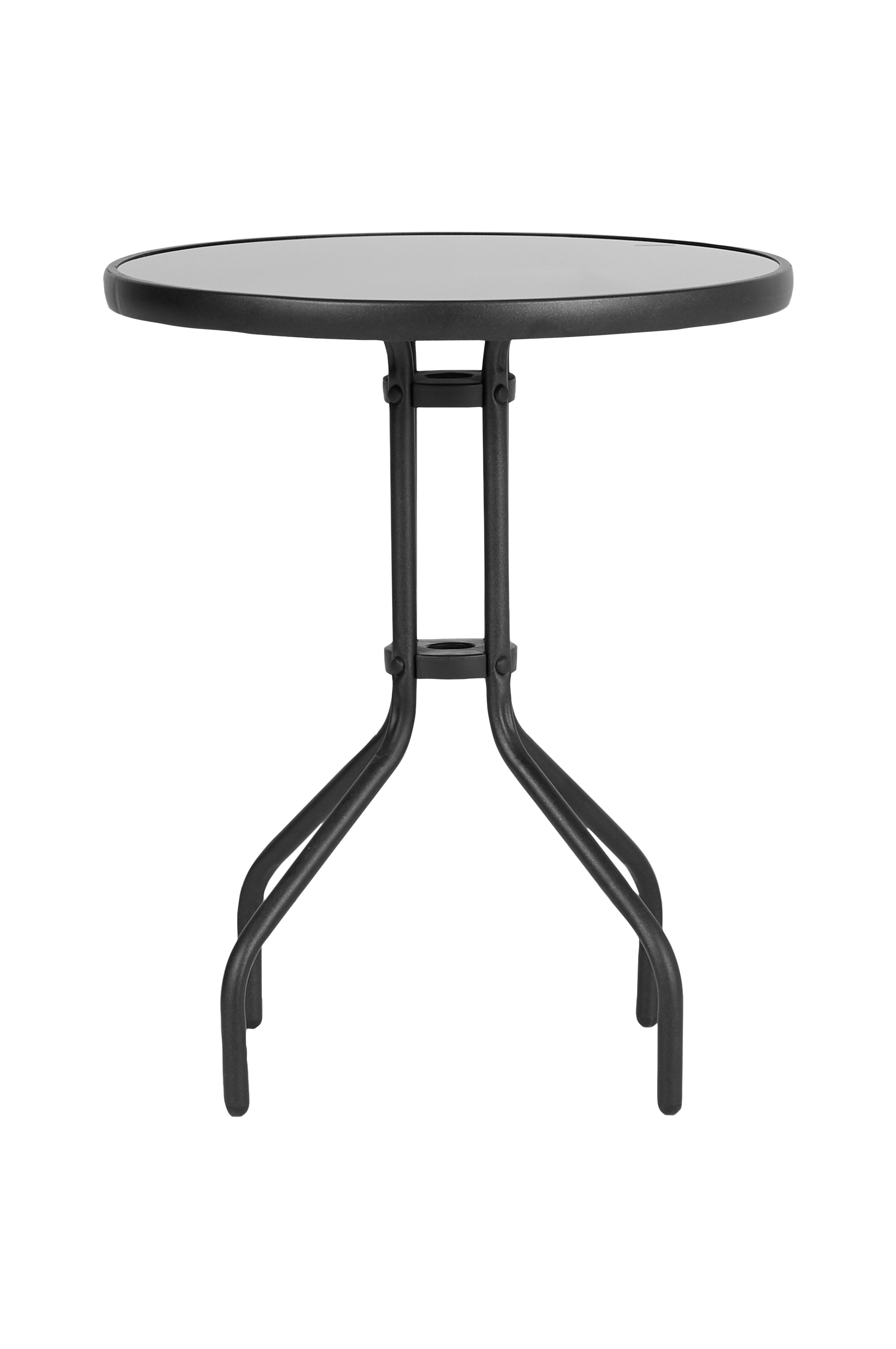 Tavallinen kahvilapöytä, jossa on paljon charmia ja hyvä massiivinen lasitaso, joka koristaa mitä tahansa pientä viihtyisää asetelmaa terassilla.