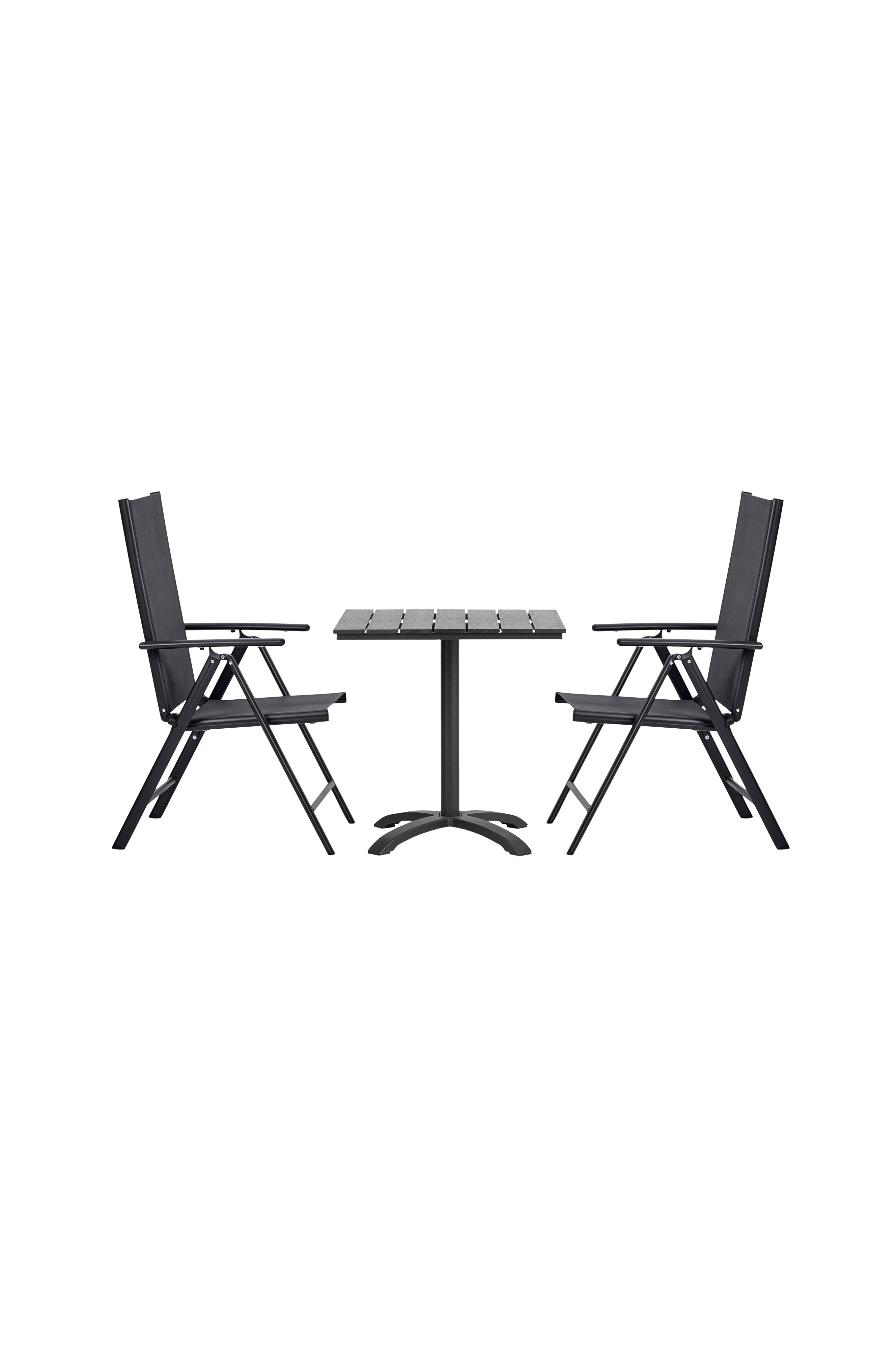 Laadukas kahvilapöytä, jossa musta alumiinirunko ja nelikulmainen pöytälevy mustaa, mäntyä muistuttavaa polywoodia.