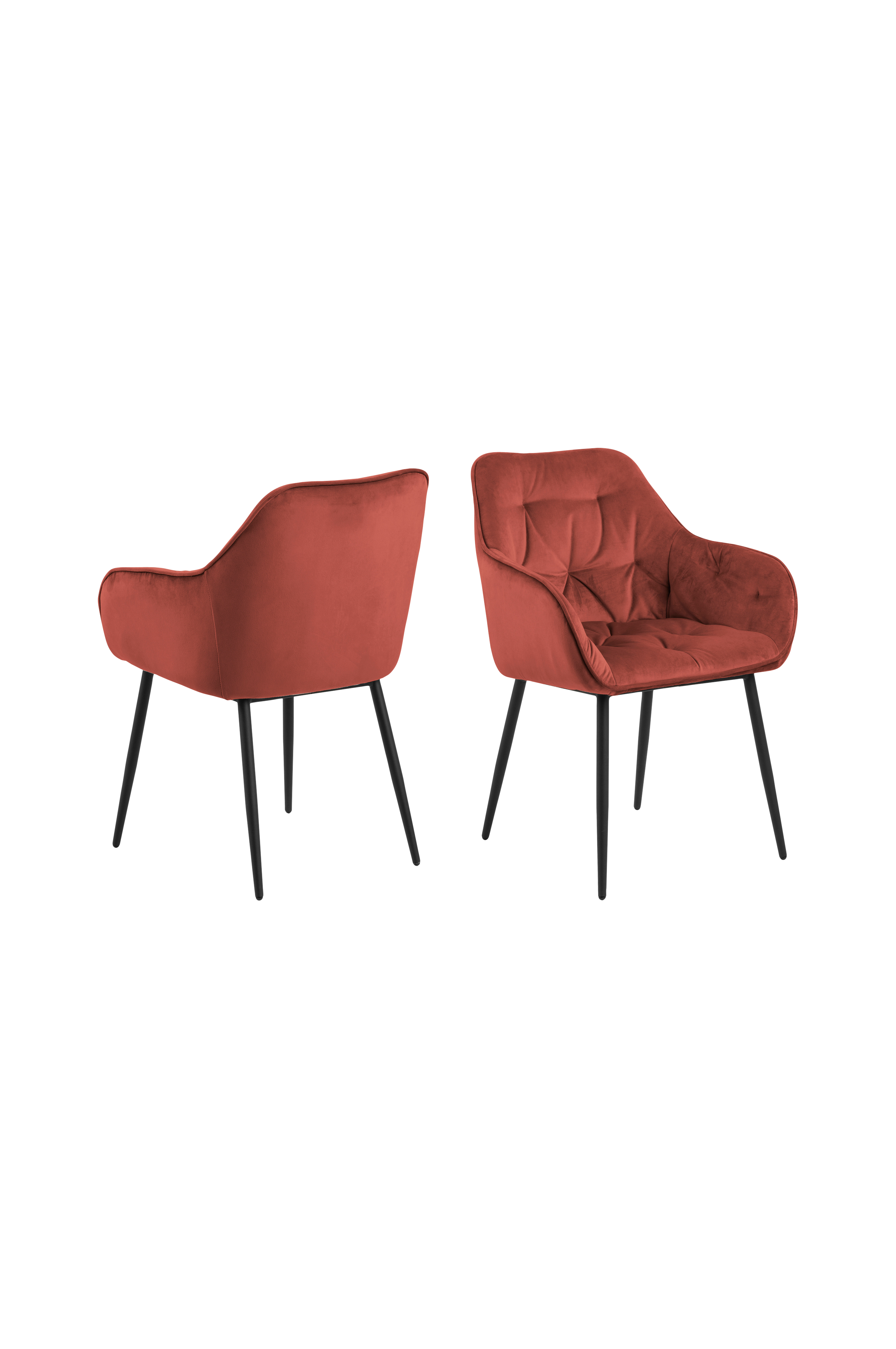 Käsinojalliset Brook-tuolit myydään 2 kpl:n pakkauksessa. Jalat jauhemaalattua metallia. Päällinen 100% polyesterisamettia, vaahtomuovipehmuste ja napit selkänojassa. Korkeus 83 cm, syvyys 55 cm, leveys 58 cm. Istuinkorkeus 47 cm. Toimitetaan jalat irrallaan.